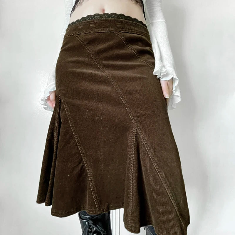 Hnewly Grunge y2k Brown Skirt Spring Autumn Retro Lace Stitching Low Rise A-line Midi Skirts for Women Vintage y2k Clothing Lady