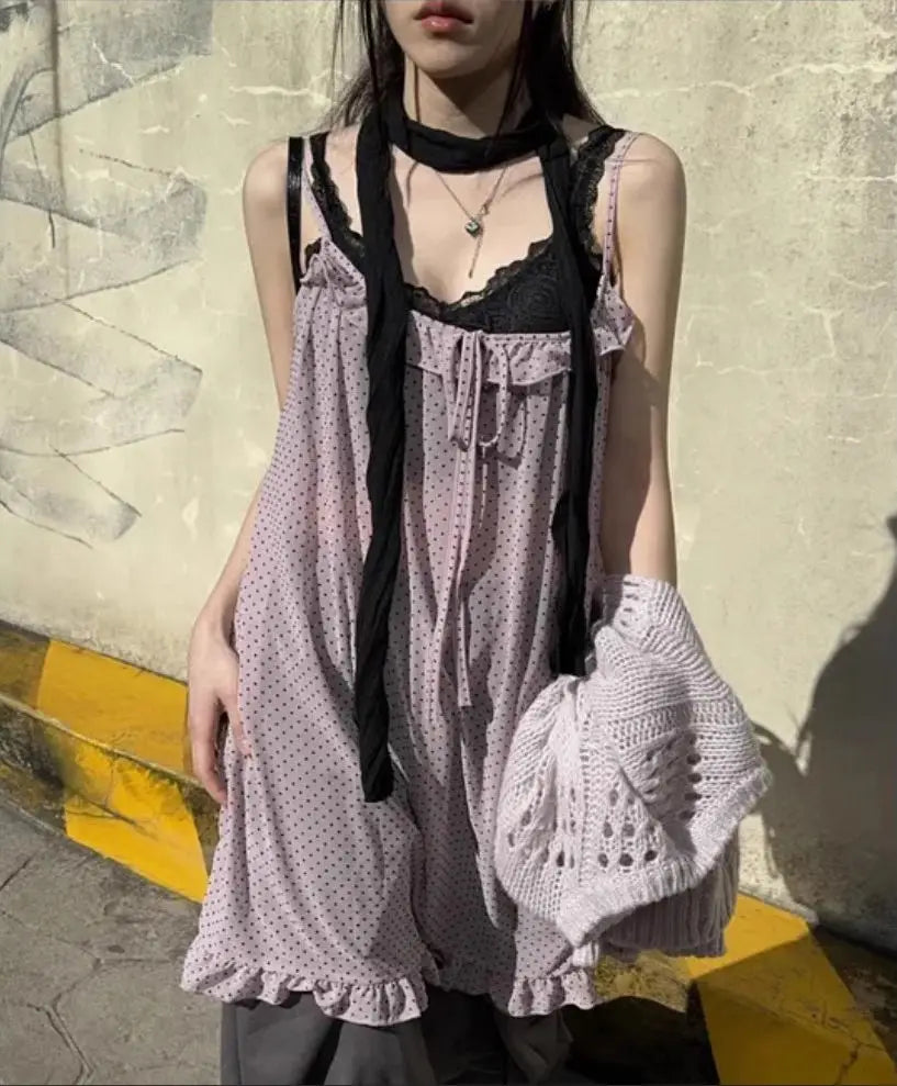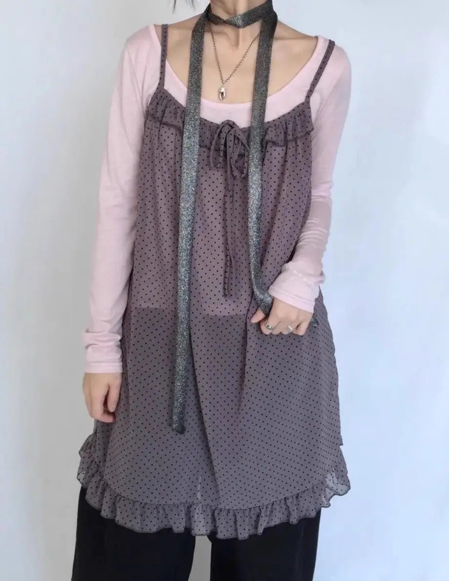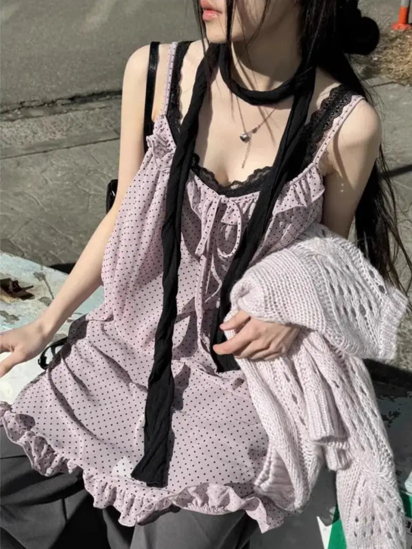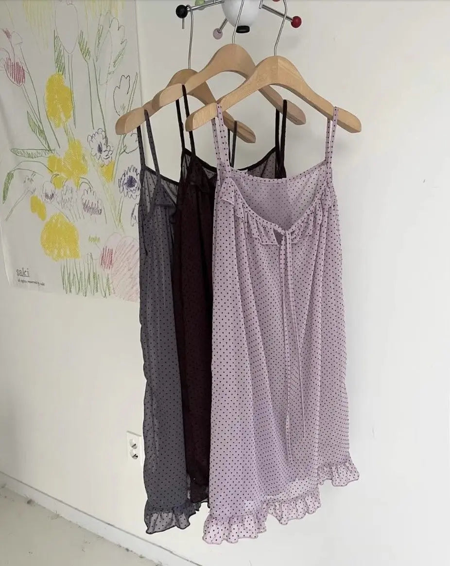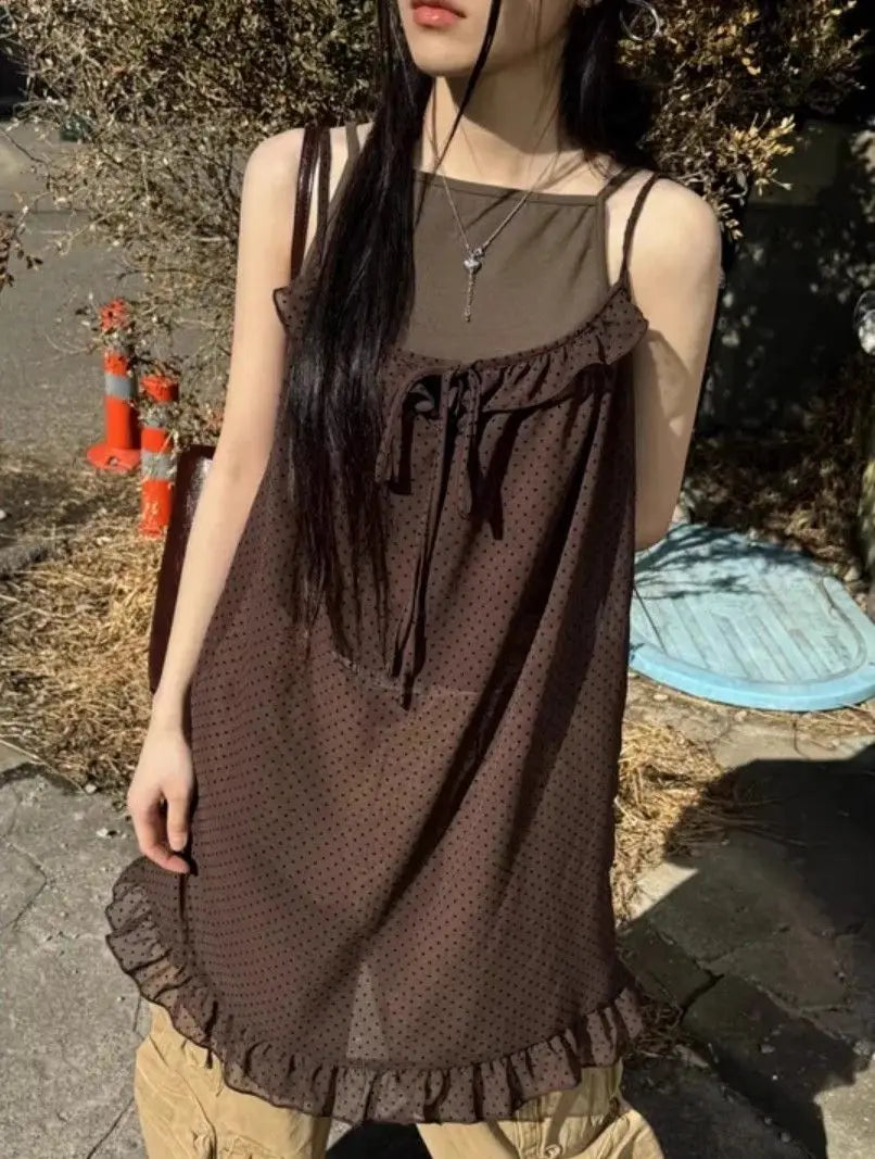 Hnewly Harajuku Japanese Style Tank Tops Women Vintage Polka Dot Ruffle Sleeveless Mesh Dress Sexy See-through Layered Wear