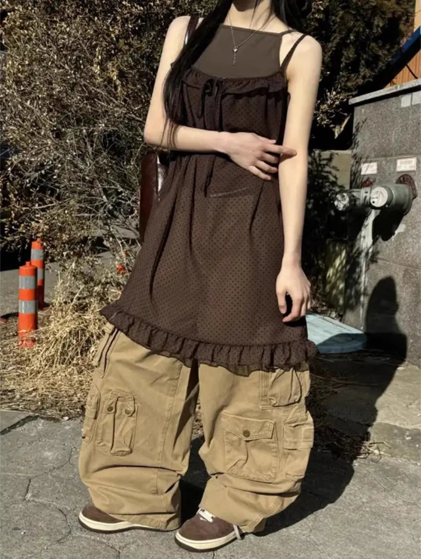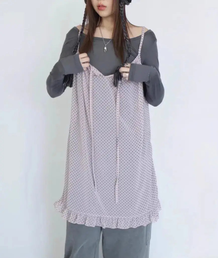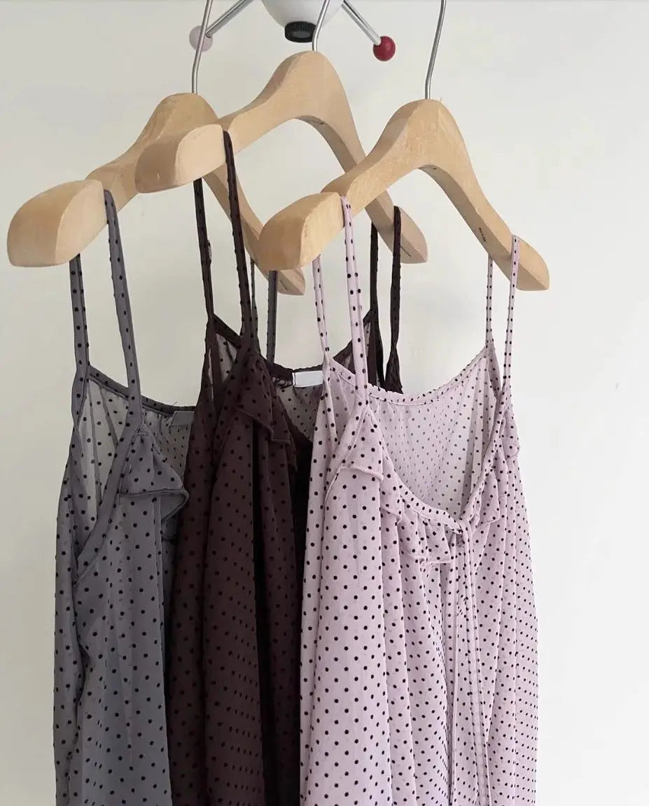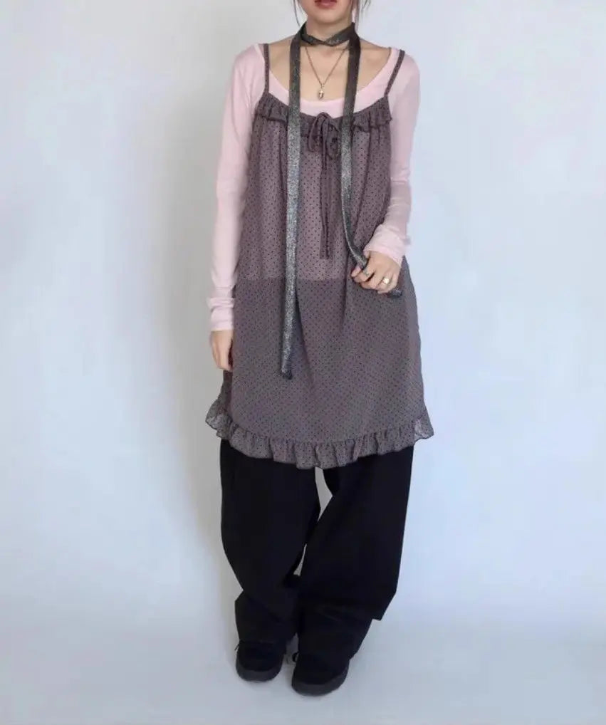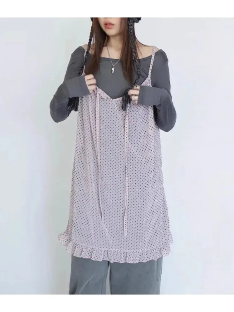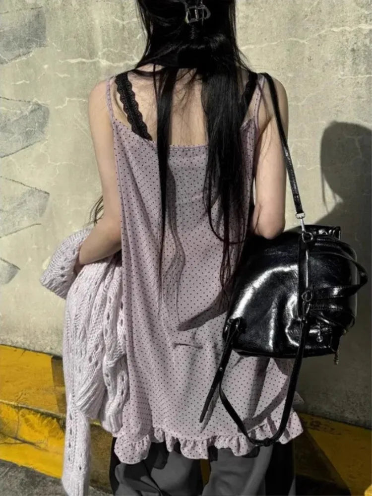 Hnewly Harajuku Japanese Style Tank Tops Women Vintage Polka Dot Ruffle Sleeveless Mesh Dress Sexy See-through Layered Wear