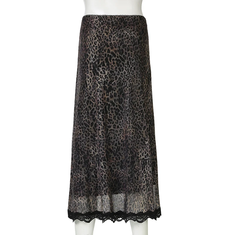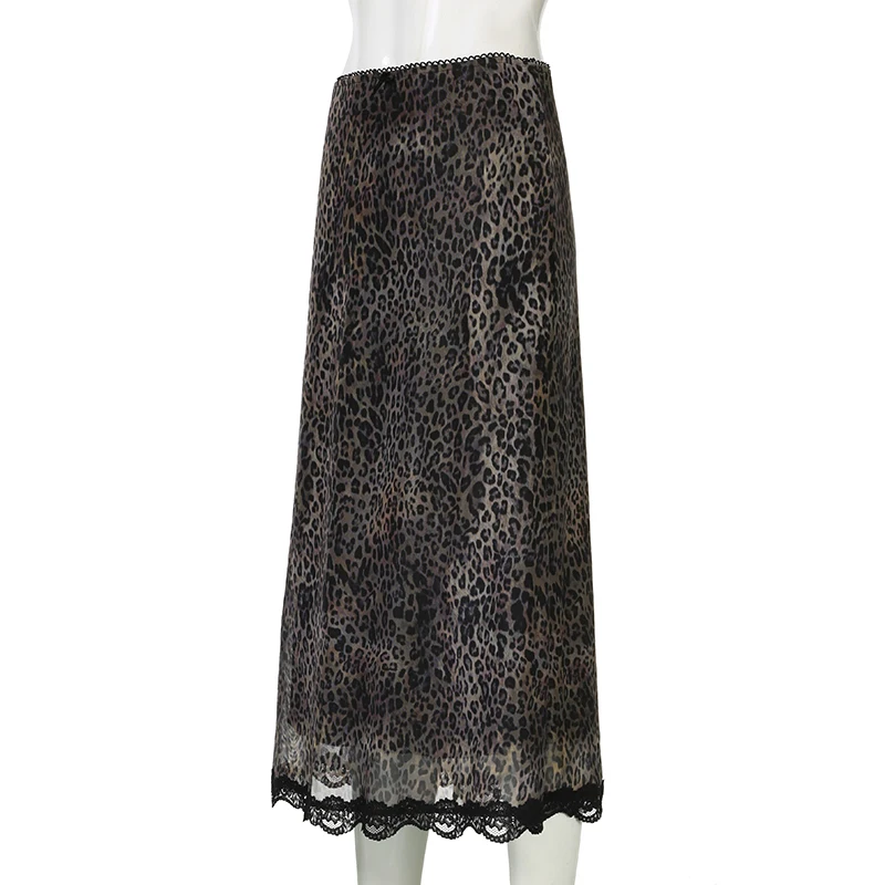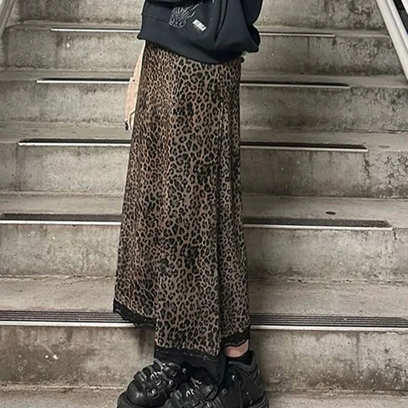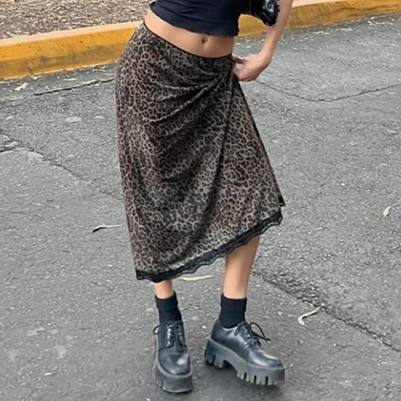 Hnewly Harajuku Leopard Print Midi Skirt Vintage y2k Lace PAtchwork Low Rise Long Skirts for Women Autumn All-match Skirt Ladies