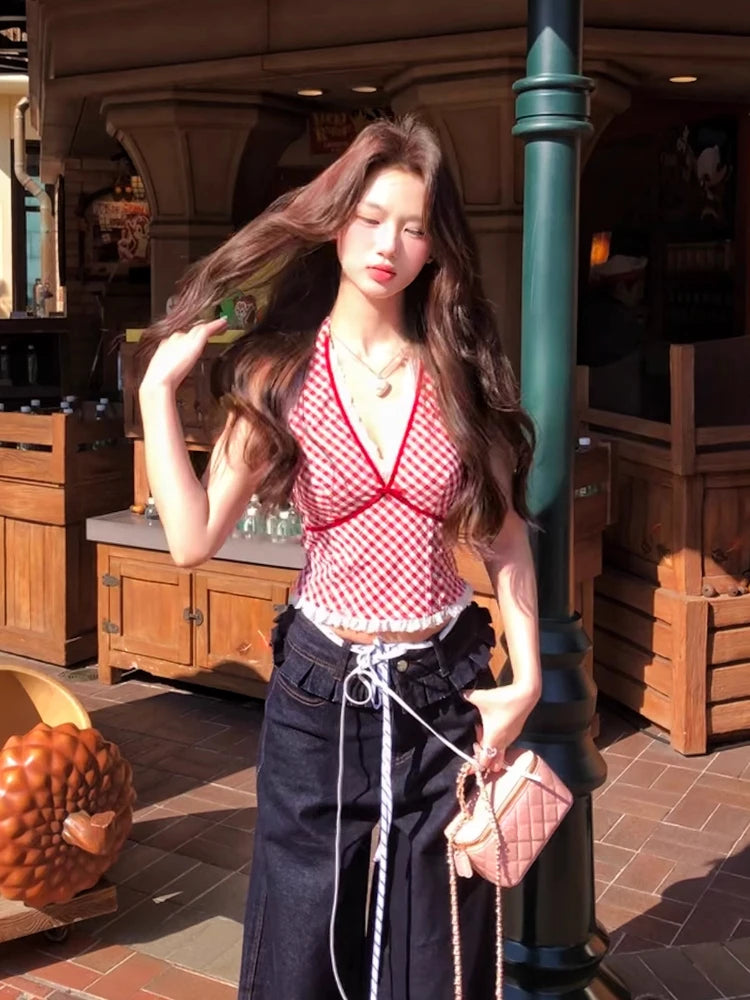 Hnewly Harajuku Red Plaid Tank Top Vest Women Summer Sleeveless V-Neck Sexy Bodycon Tshirts Female Outwear Bodycon T-shirts Chic Korean