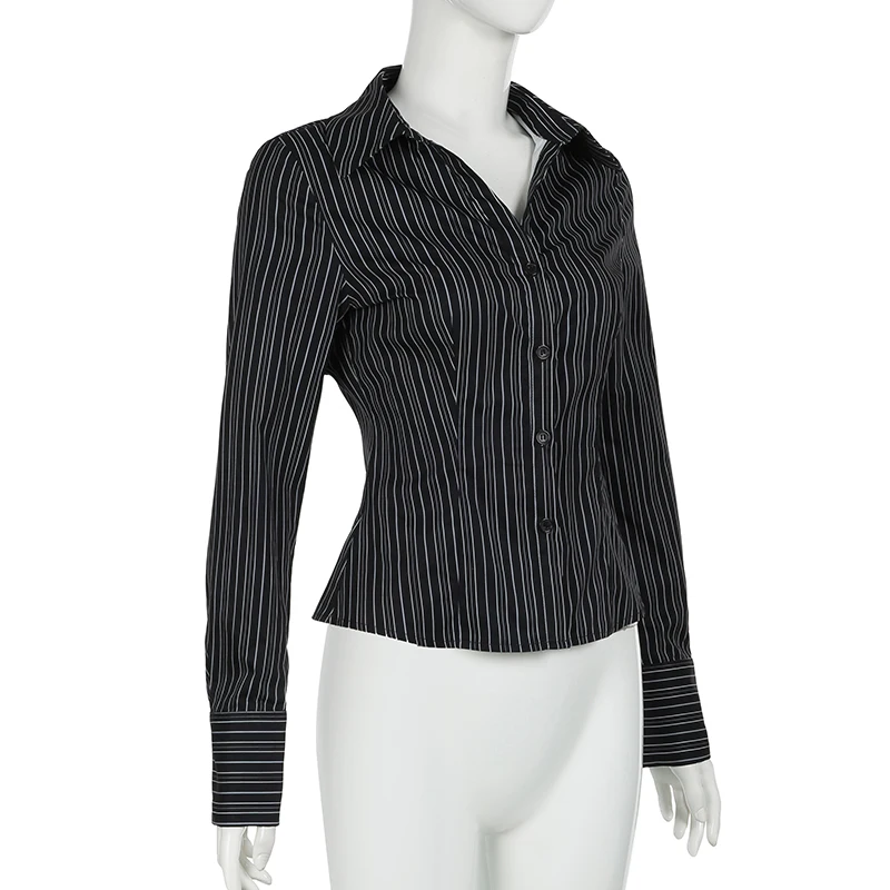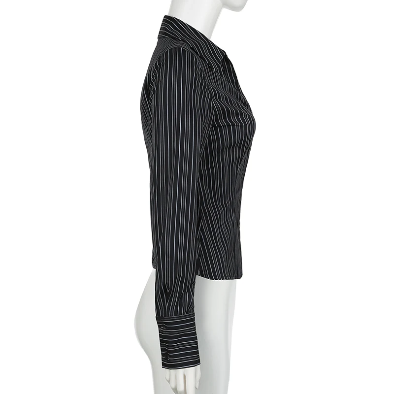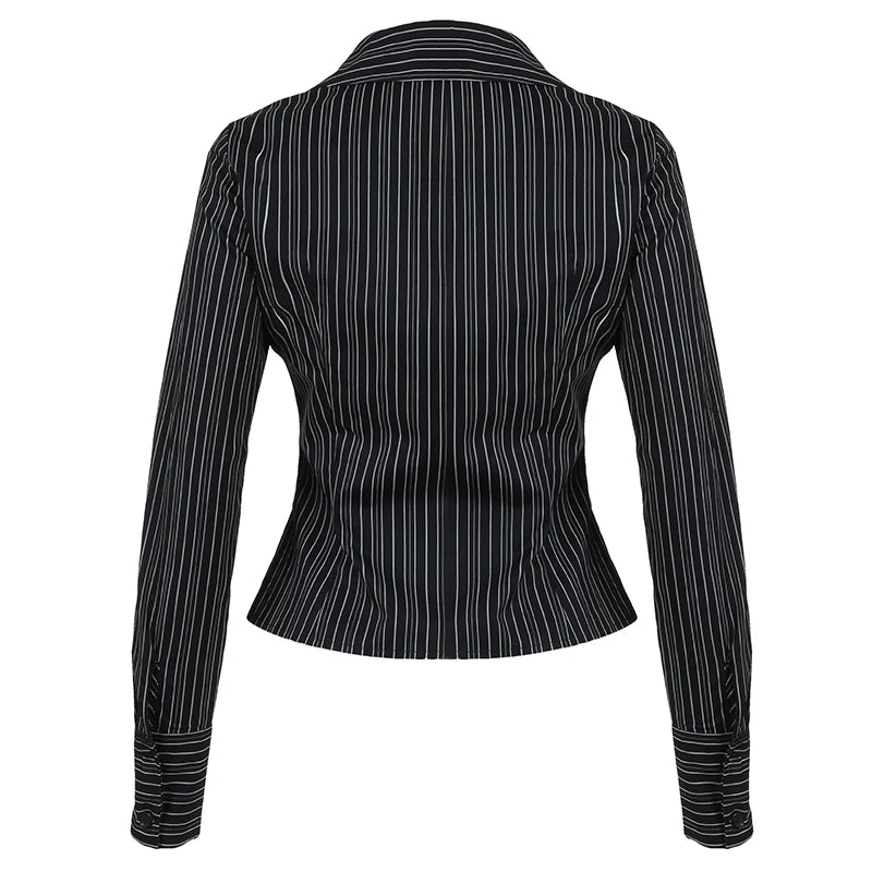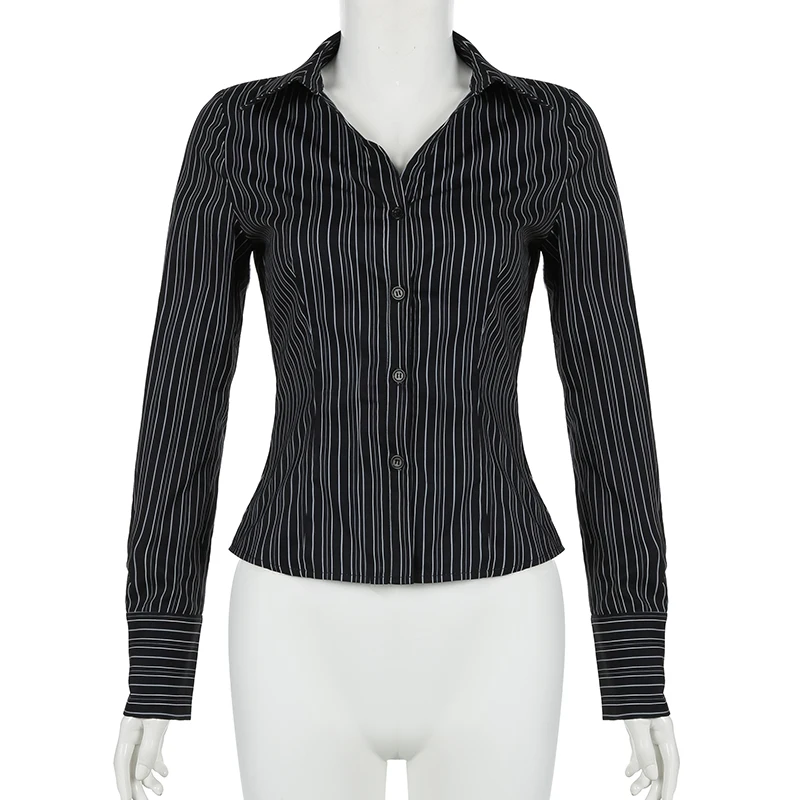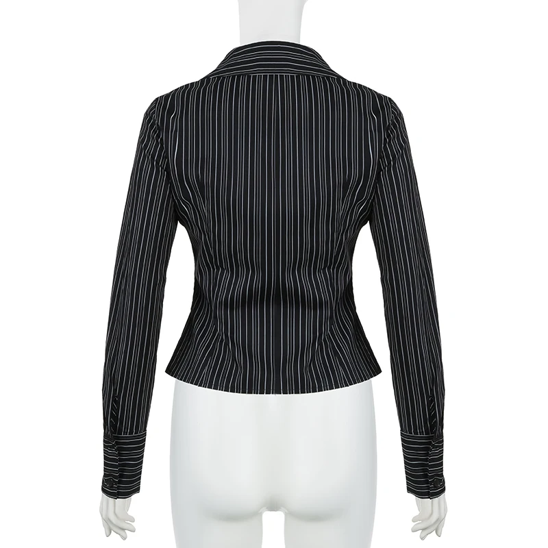 Hnewly Harajuku Striped Crop Top Women Casual Black Button Up Full Sleeve Turn-down Neck Blouse y2k Aesthetic Autumn Tee Shirts