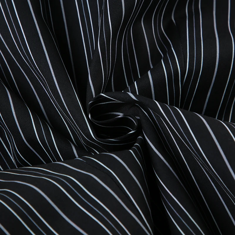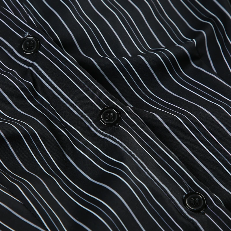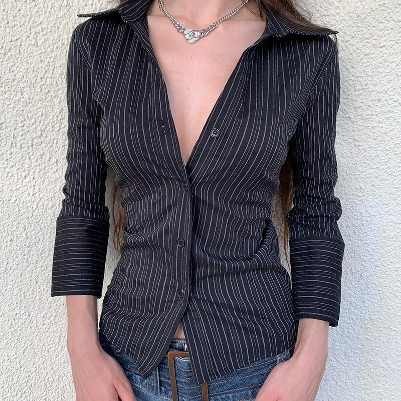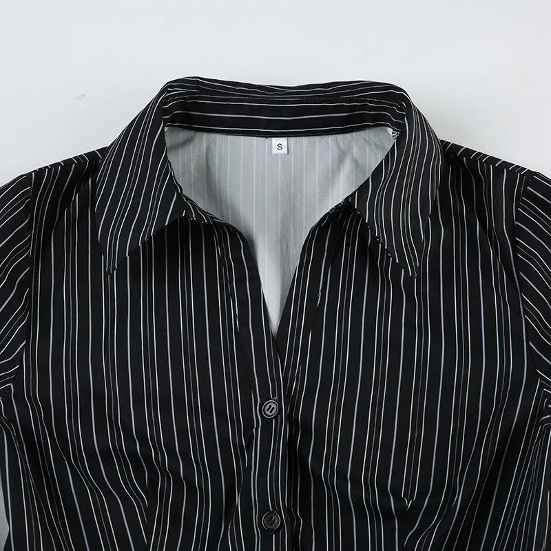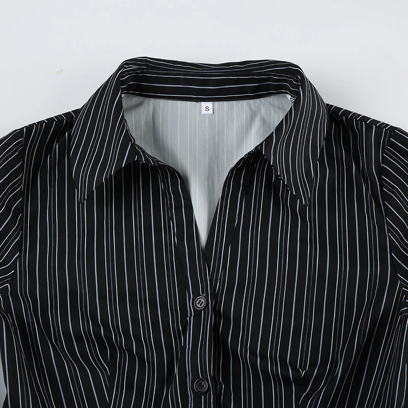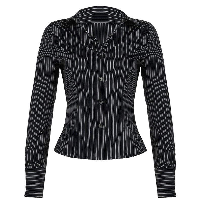 Hnewly Harajuku Striped Crop Top Women Casual Black Button Up Full Sleeve Turn-down Neck Blouse y2k Aesthetic Autumn Tee Shirts
