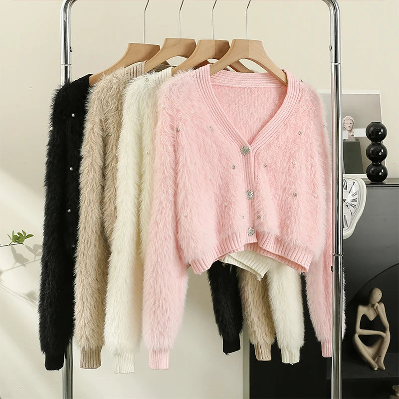 Hnewly Heart Button Plush Soft Sweater Coat Autumn/Winter New Women's Fashion Shiny Diamond V-Neck Short Knitted Cardigan Top