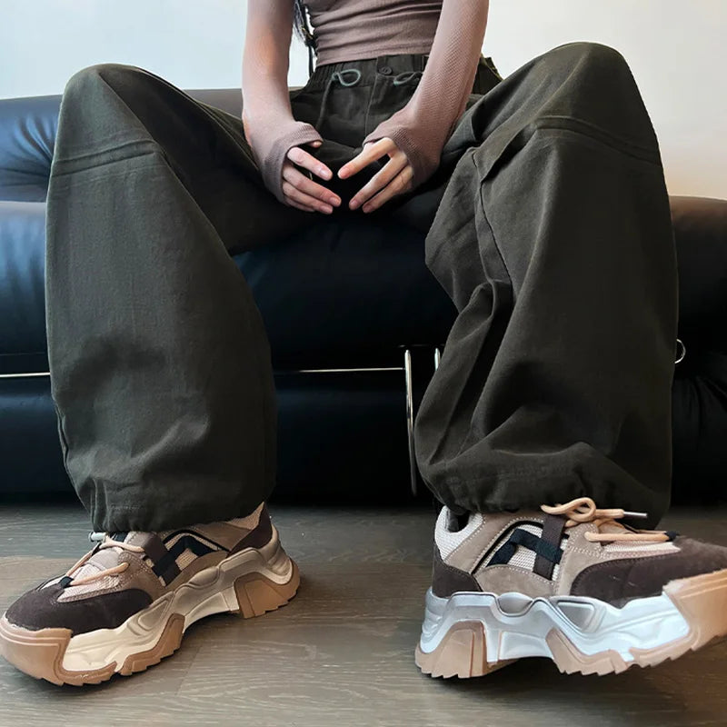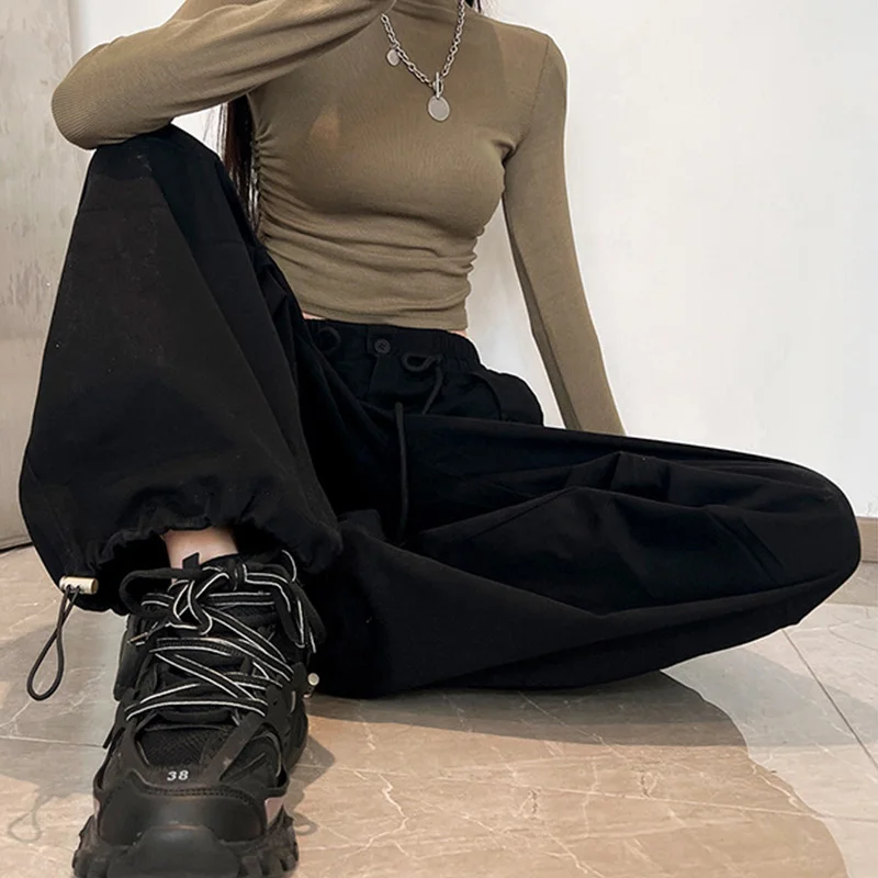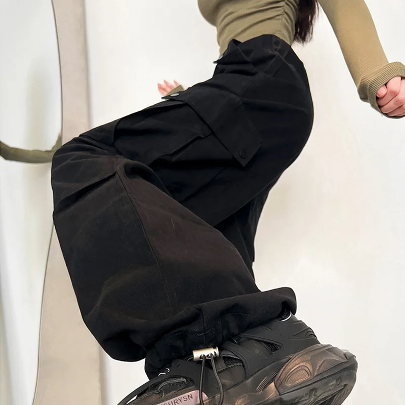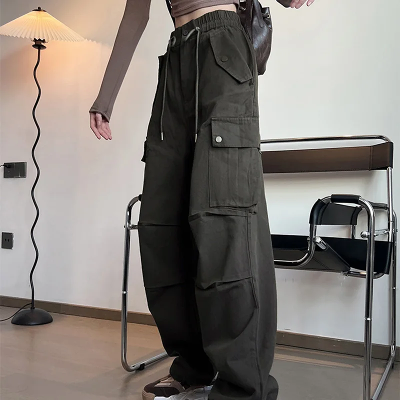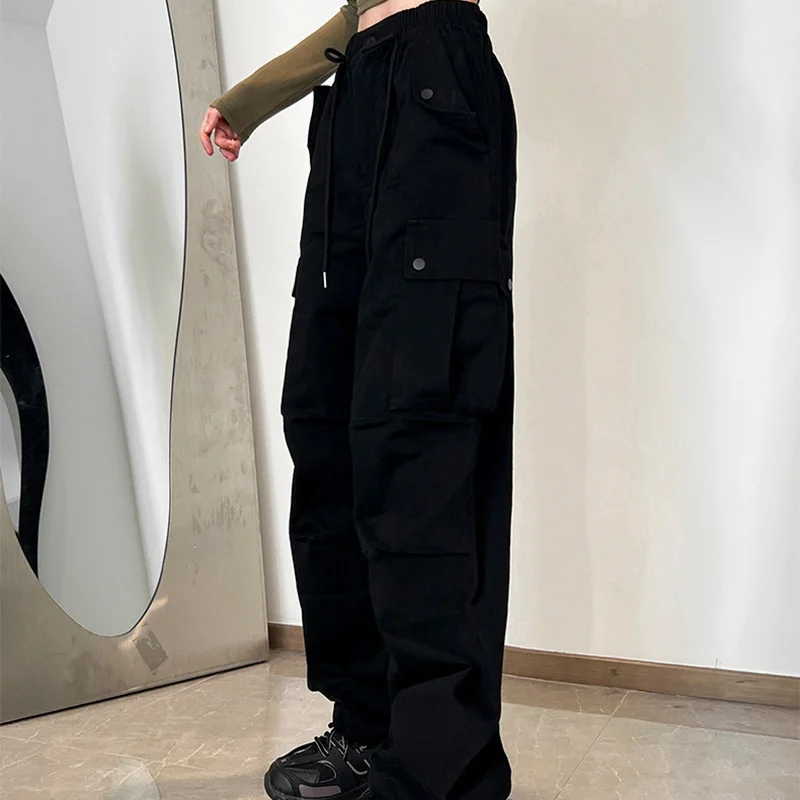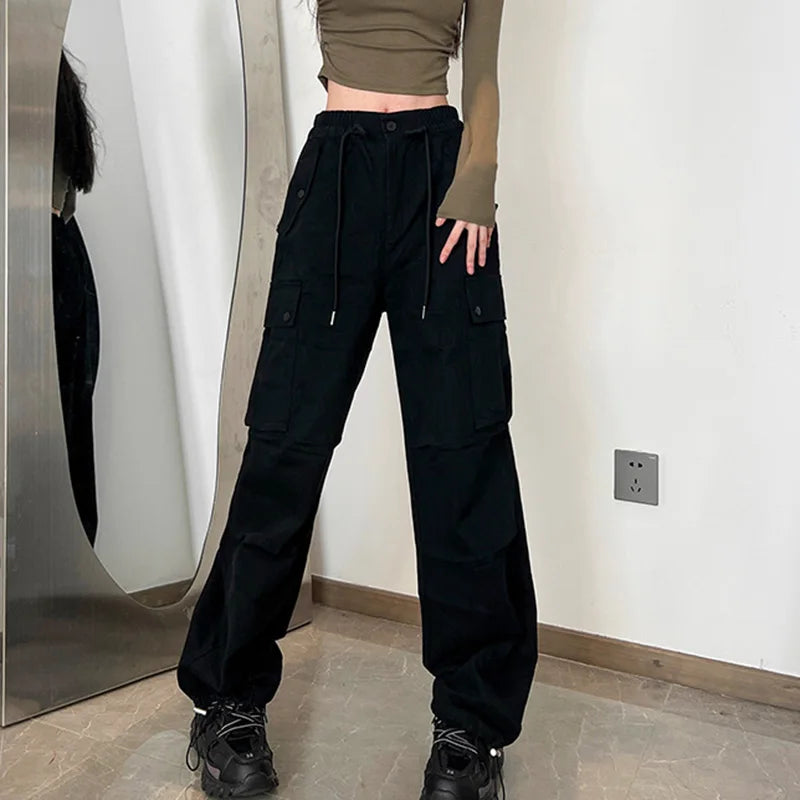 Hnewly High Street Multi Pockets Cargo Pants Women Autumn Sporty Drawstring High Waist Pants Woman Button Wide Leg Trousers Mujer
