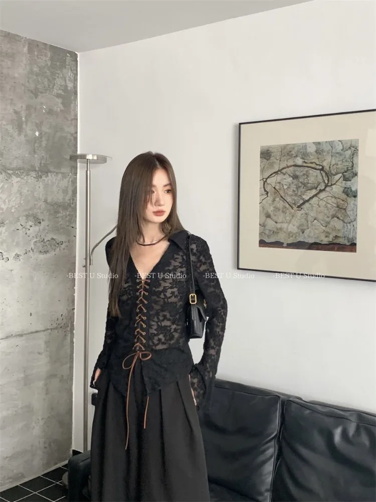 Hnewly Hollow Out Mesh V-neck Lace Up Shirts Women Y2k E-Girl Slim Fit Long Sleeve Blouses Spring New Black Blusas De Mujer