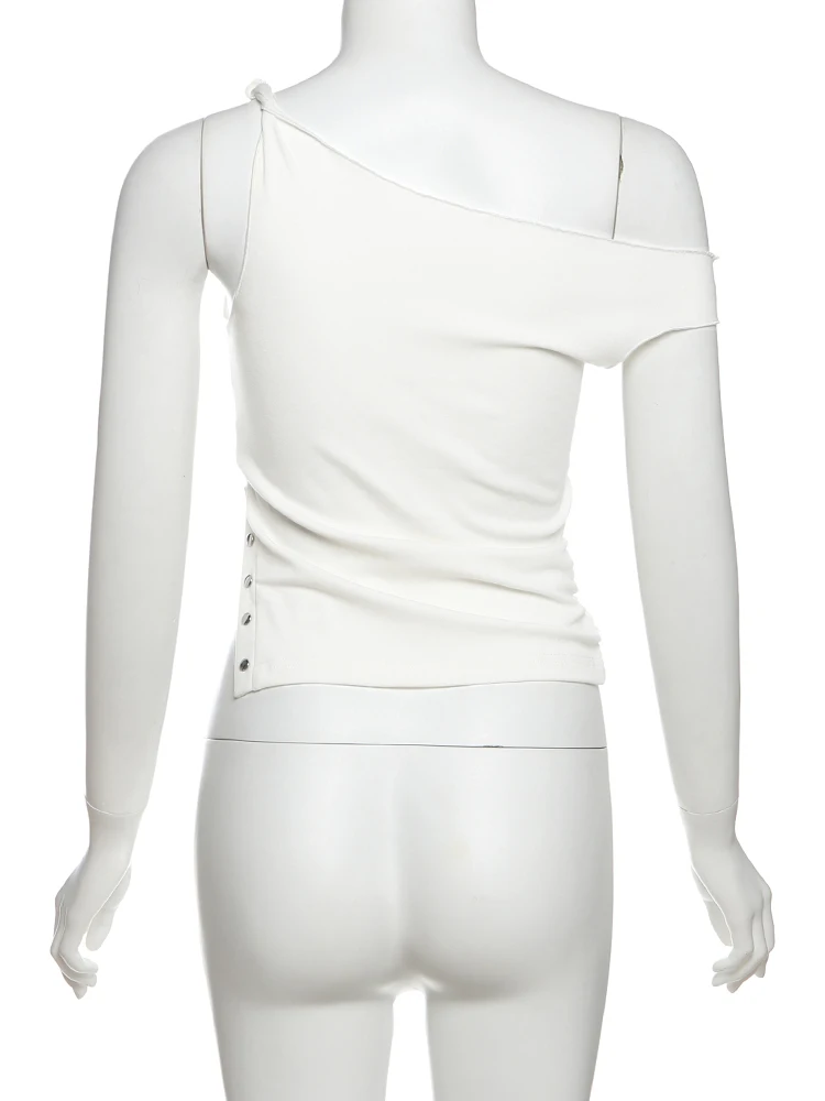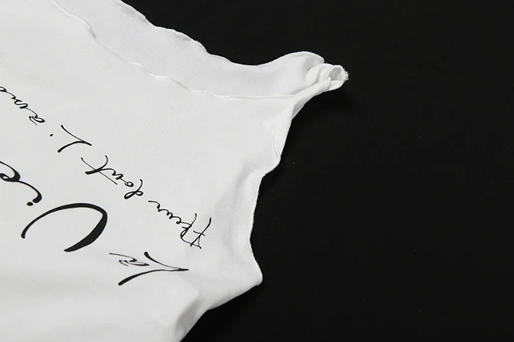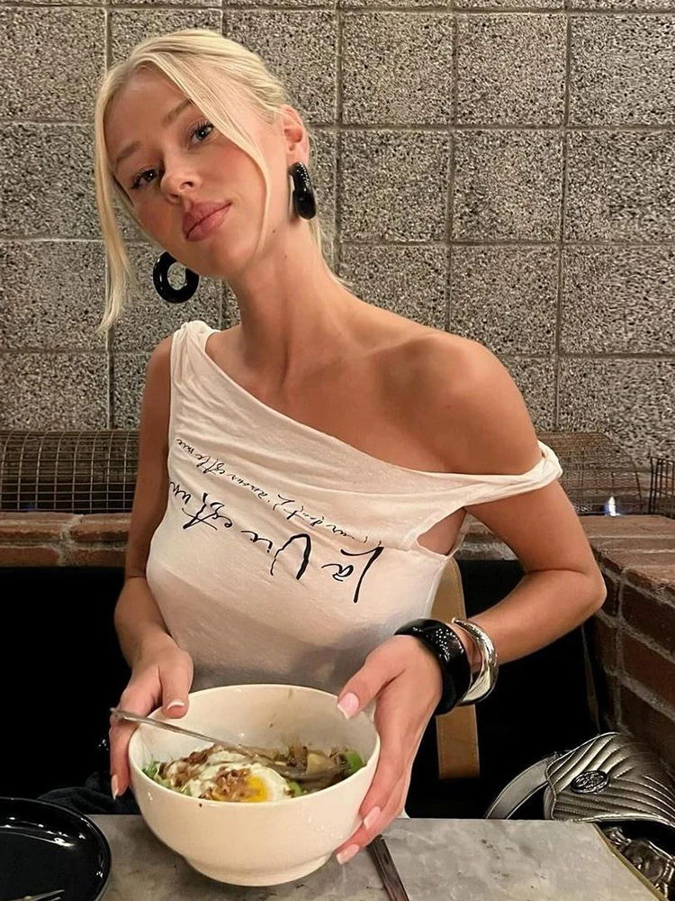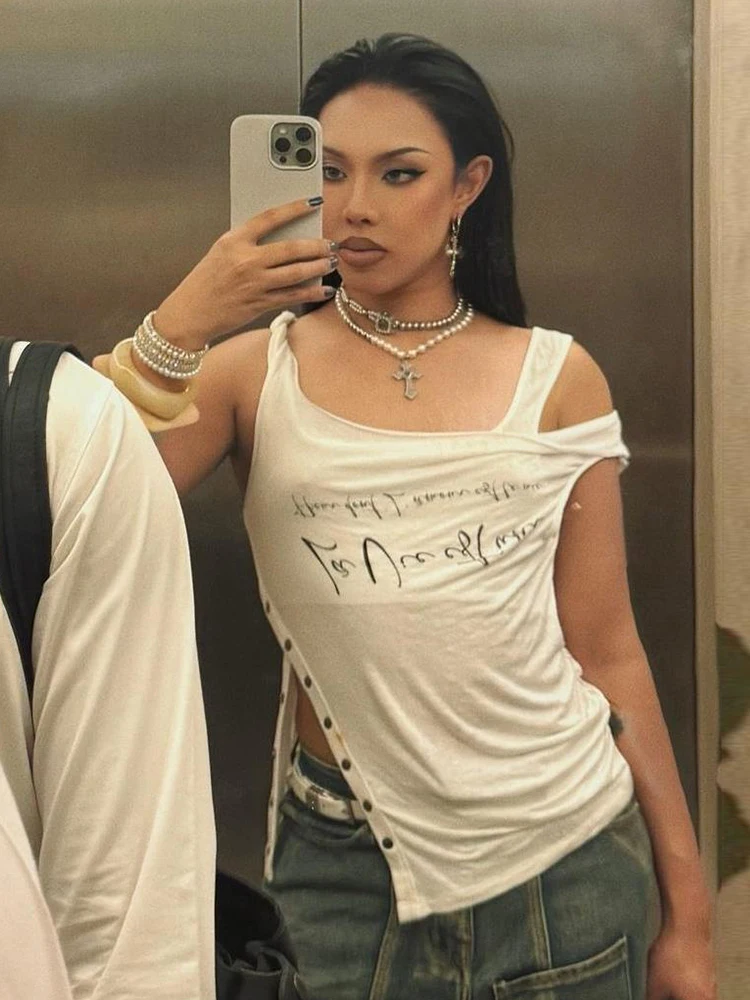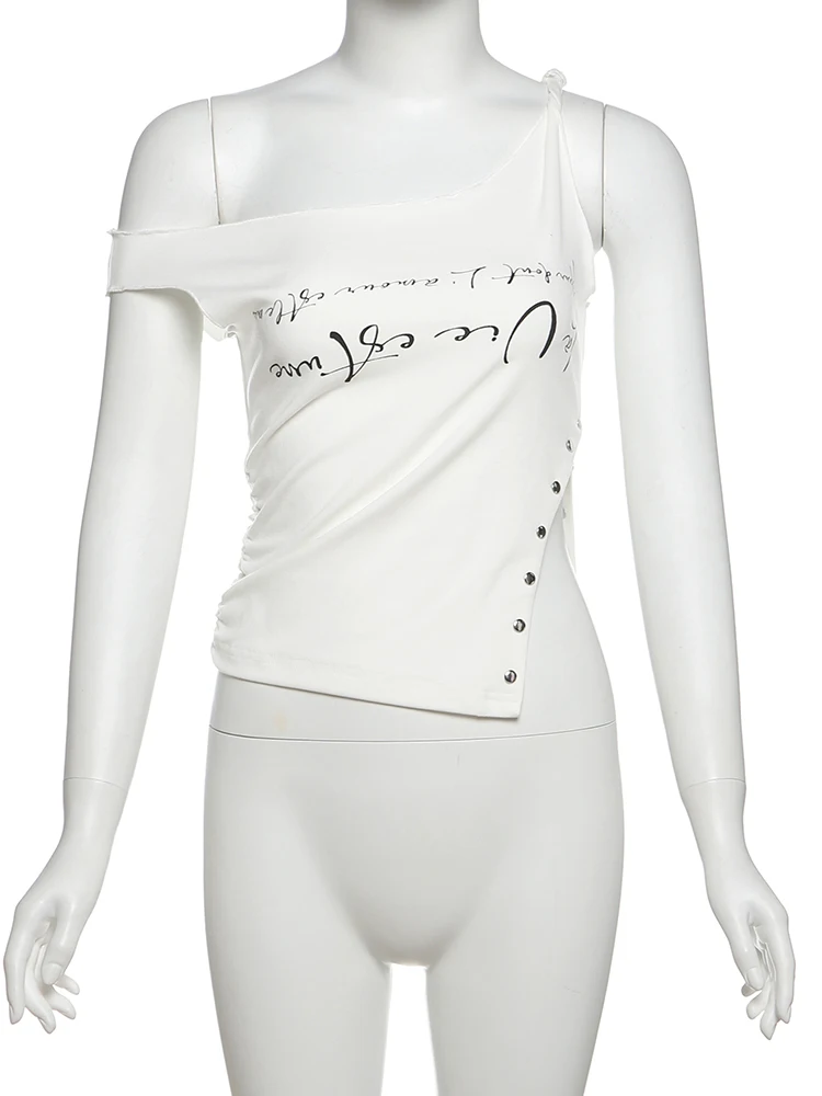 Hnewly Irregular Button Crop Tops Women Ruched Biased Collar Letter Print Side Slit Daily Casual Simple Street Basic Tees