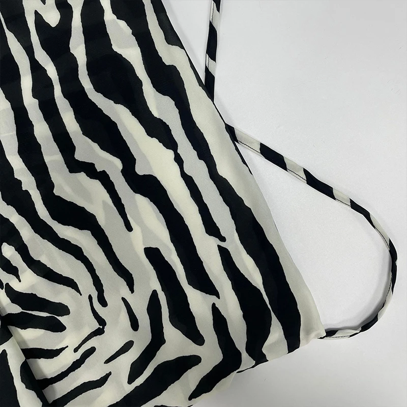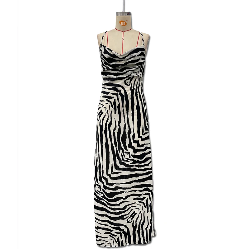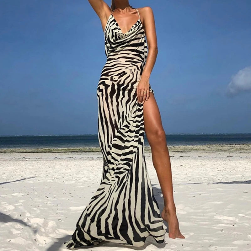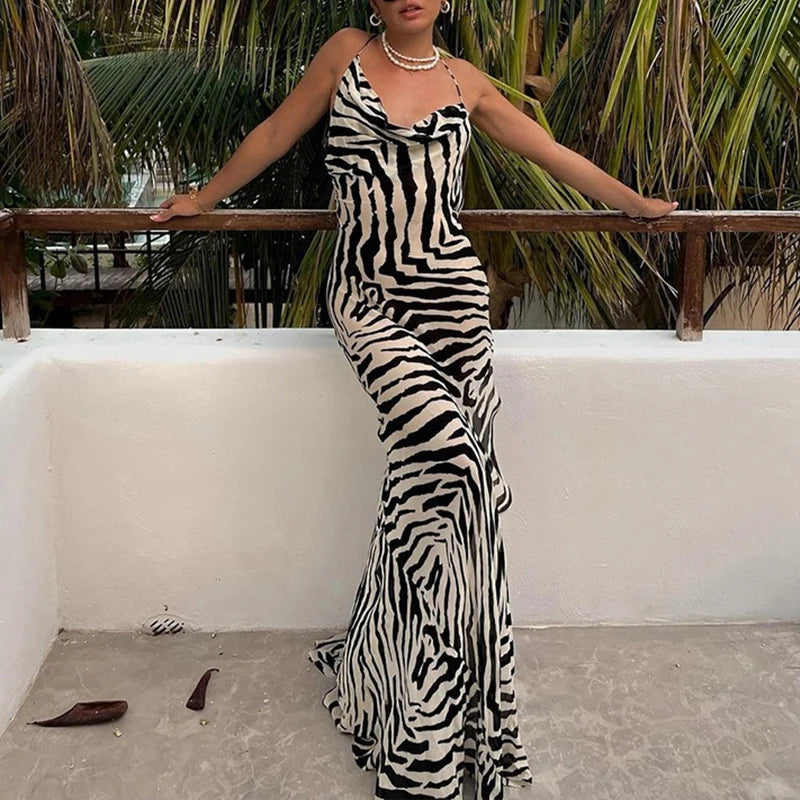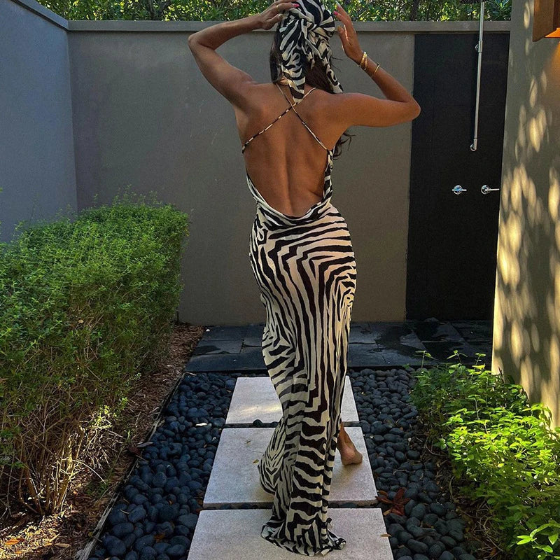 Hnewly Irregular Zebra Printing Summer Maxi Dress Halter Neck Folds Sleeveless Backless Sheath Slit Sundress Vacation Beach Outfit