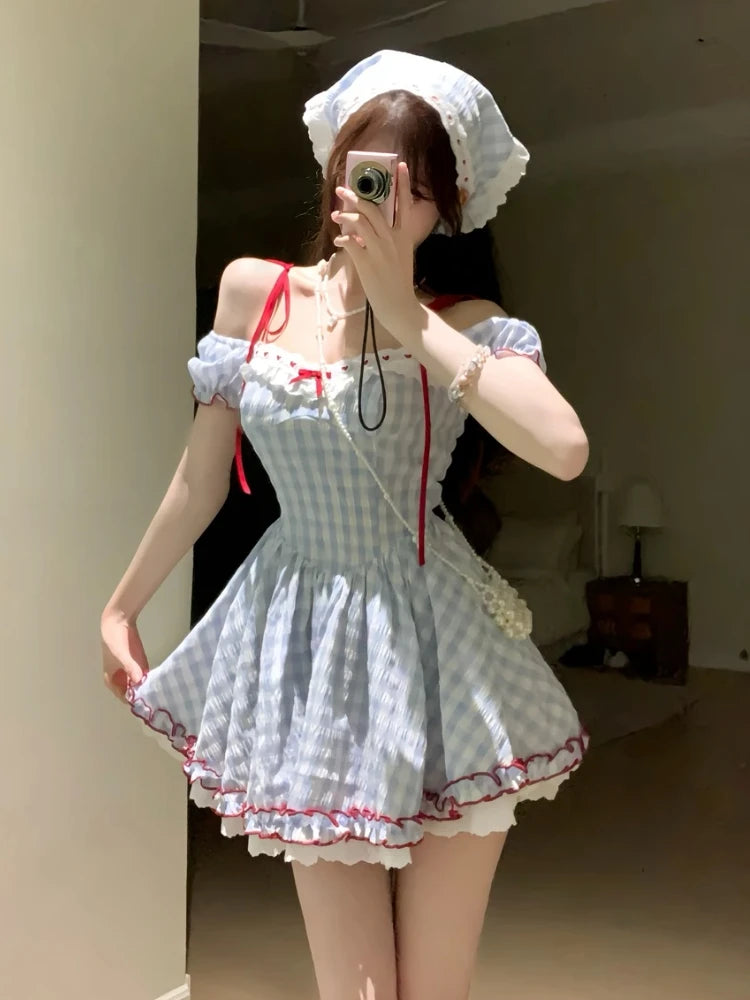 Hnewly Japanese Kawaii Sweet Short Party Dress Women Sleeve Y2k Vintage Plaid Mini Dress Female Elegant Chic Lolita Clothing Outfits