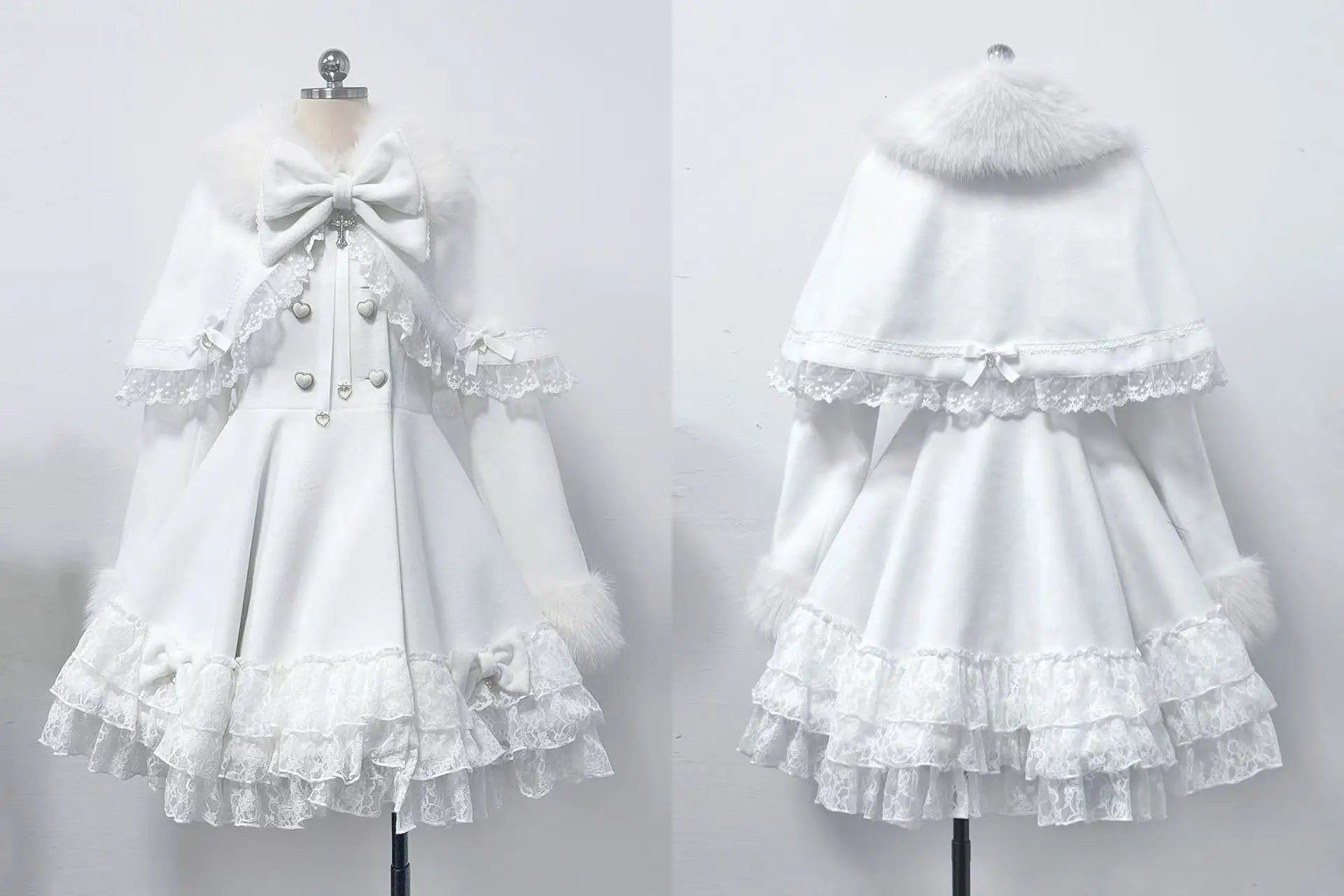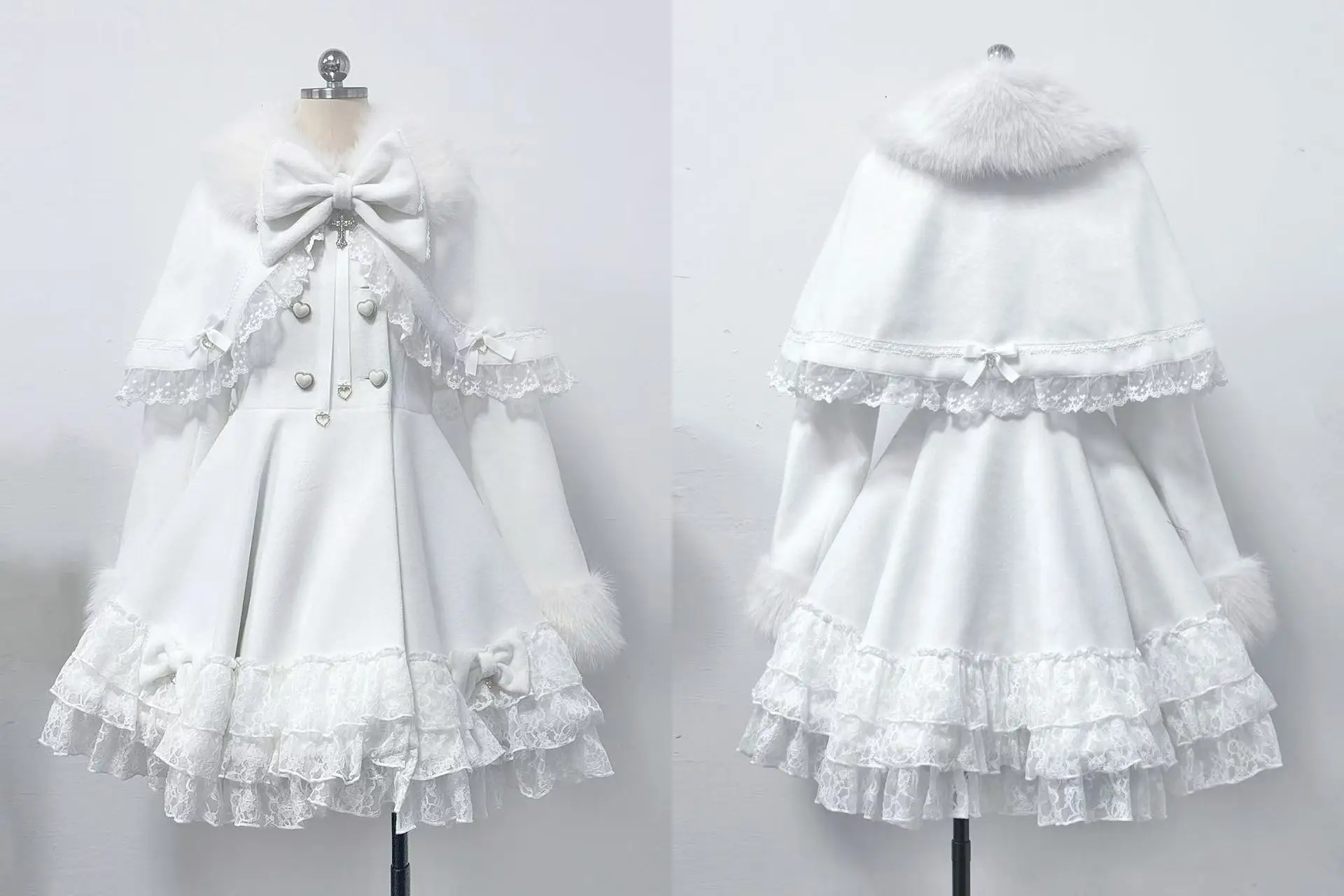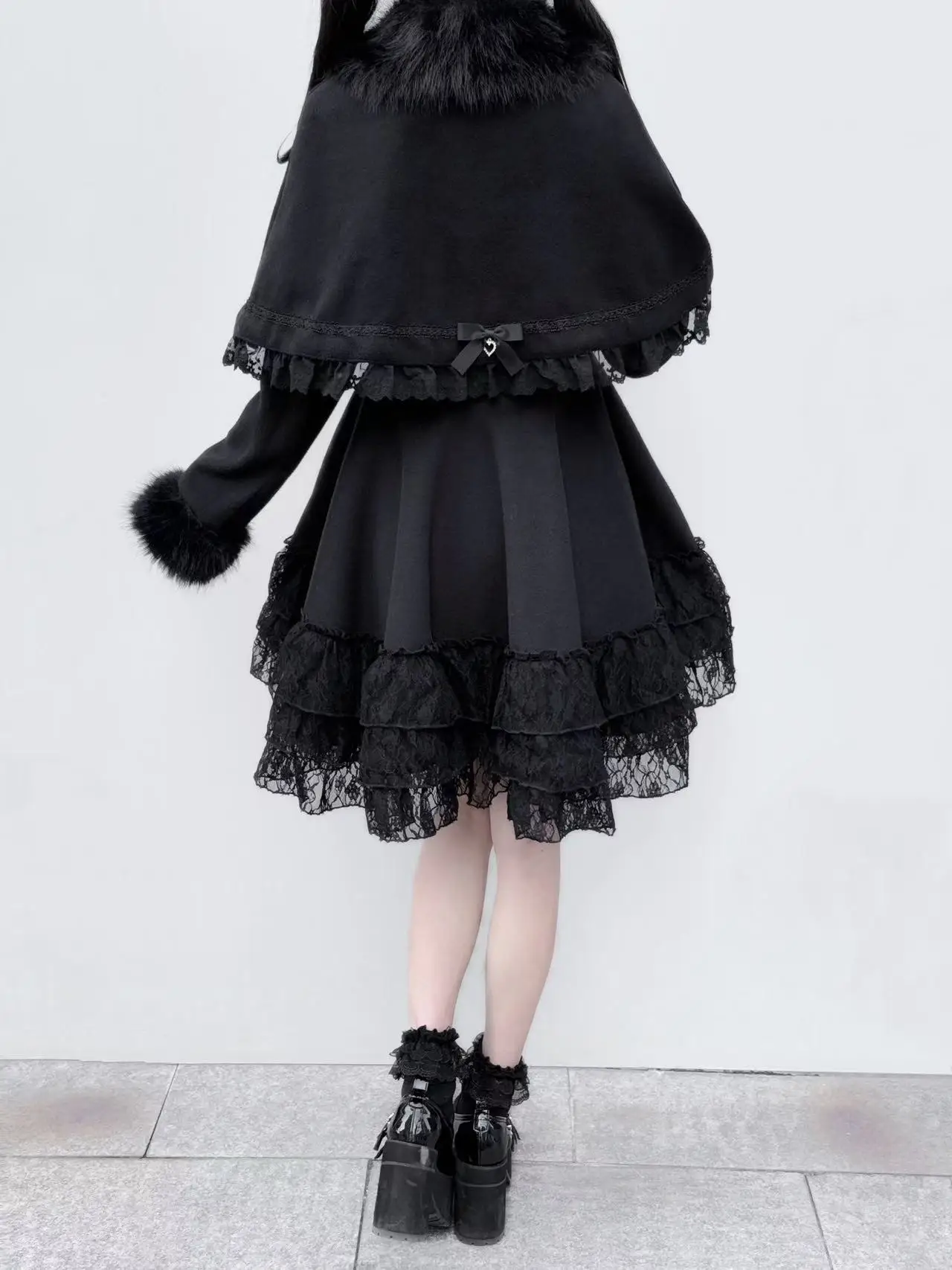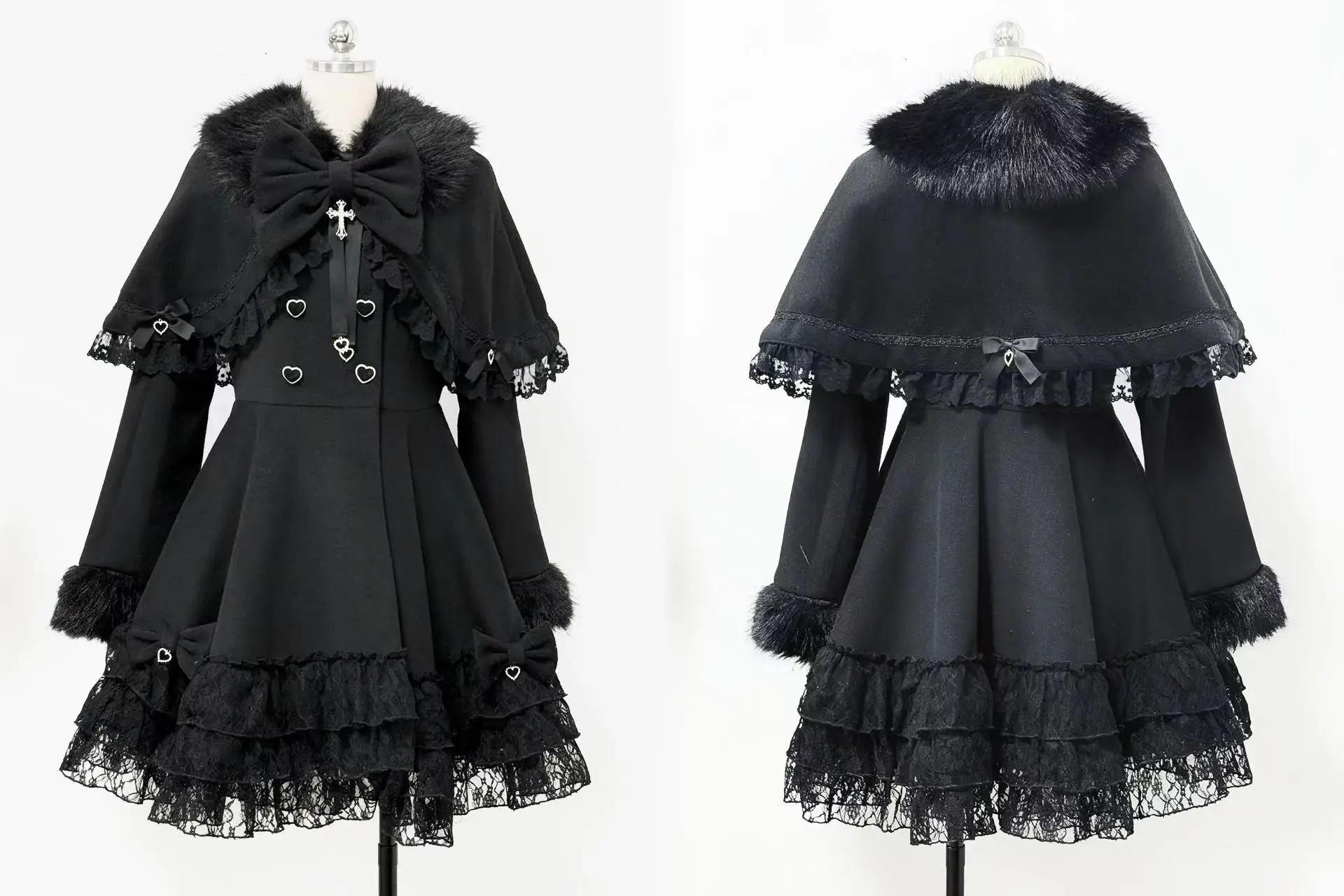Hnewly Japanese Mine Lolita Goth Slim Long Sleeve Long Winter Woolen Coat Women High-end Removable Cape Fur Collar Lace Cross Jacket