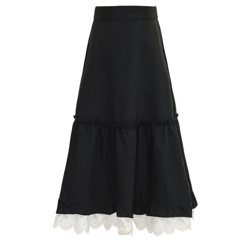 Hnewly Japanese Style Long Skirt Women Vintage Harajuku Gothic Black Skirts Elegant Lace Patchwork Autumn Winter A-line Skirt