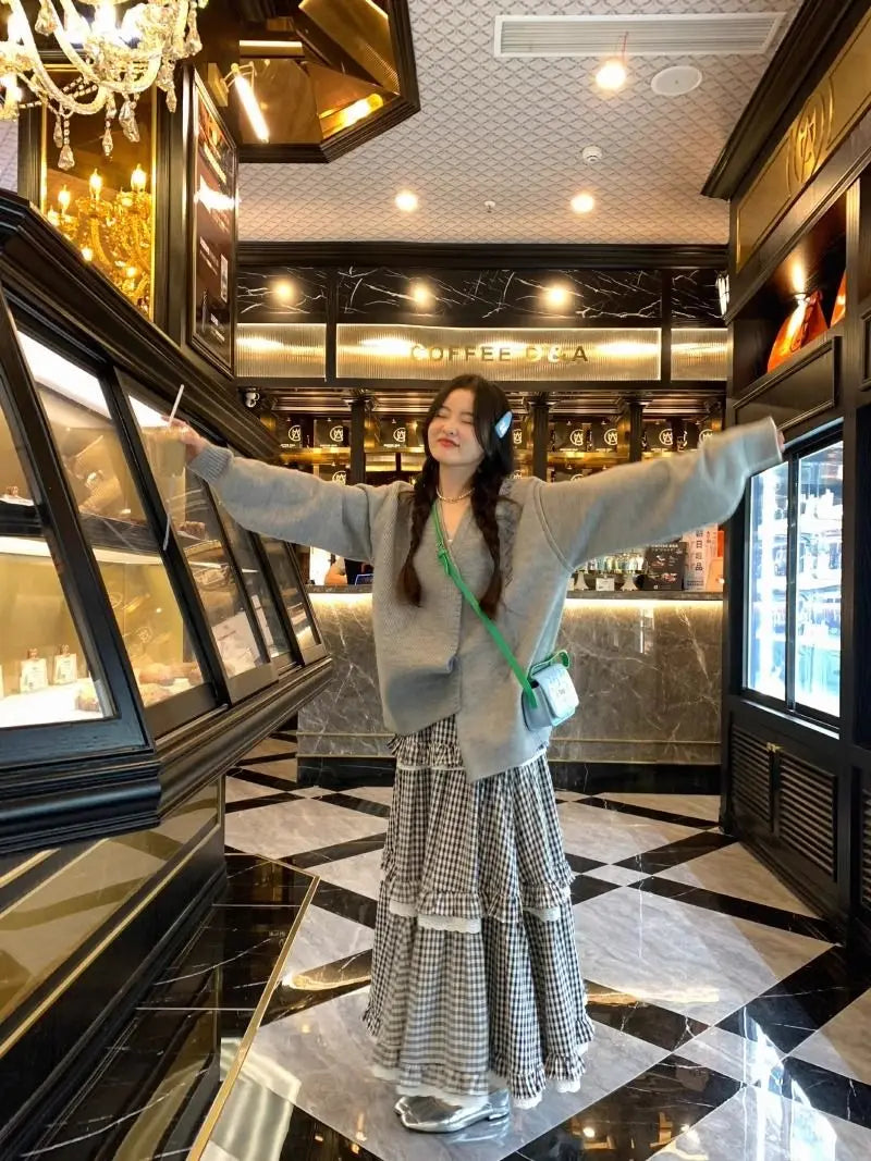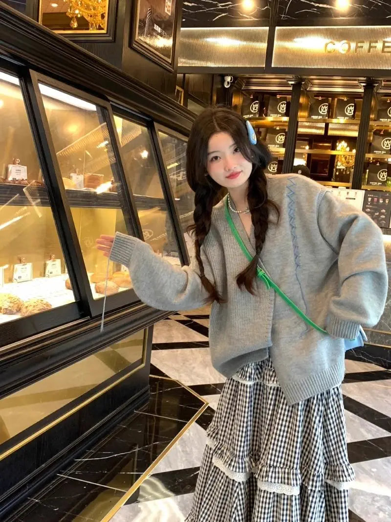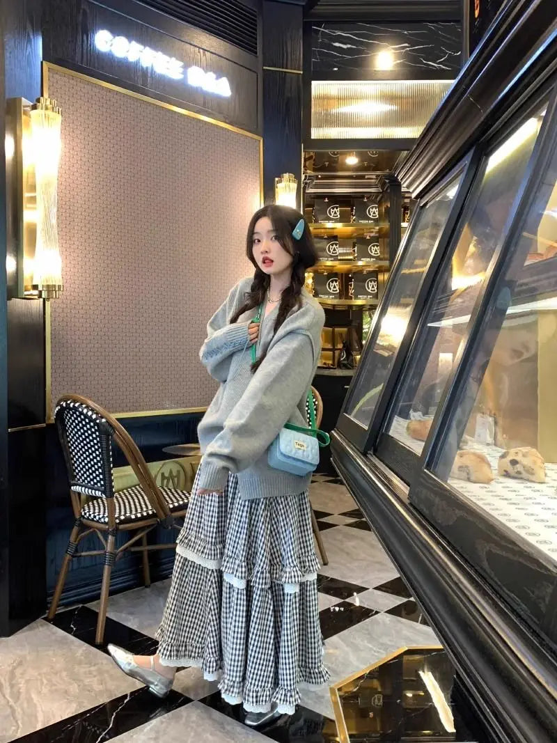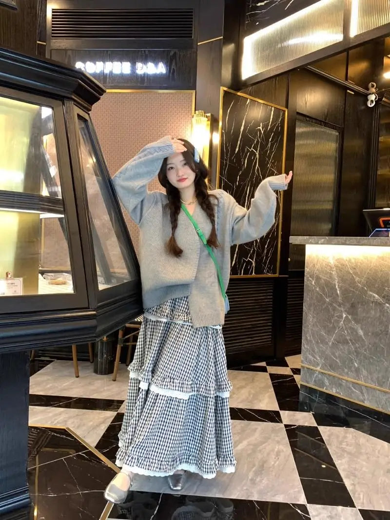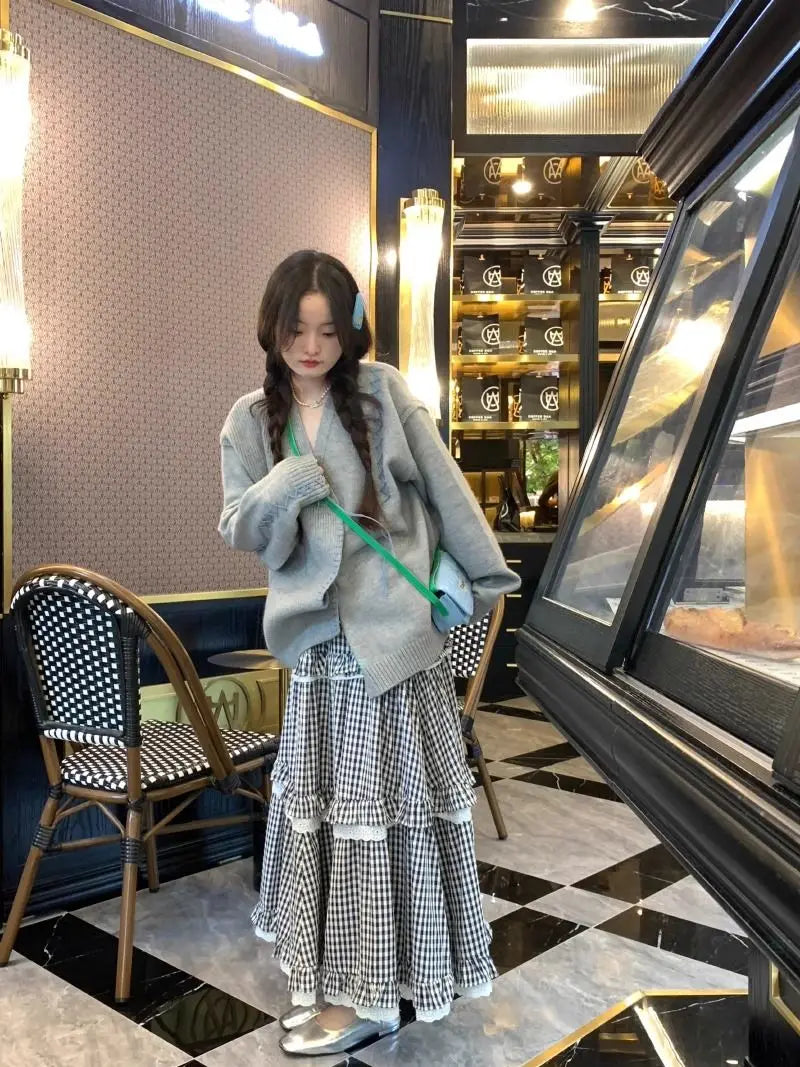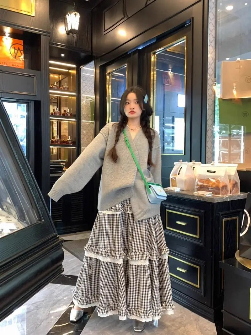 Hnewly Kawaii Harajuku Plaid Skirt Women Preppy Style Sweet Long Skirts Retro Lace Patchwork A-line Ruffle Skirts Streetwear