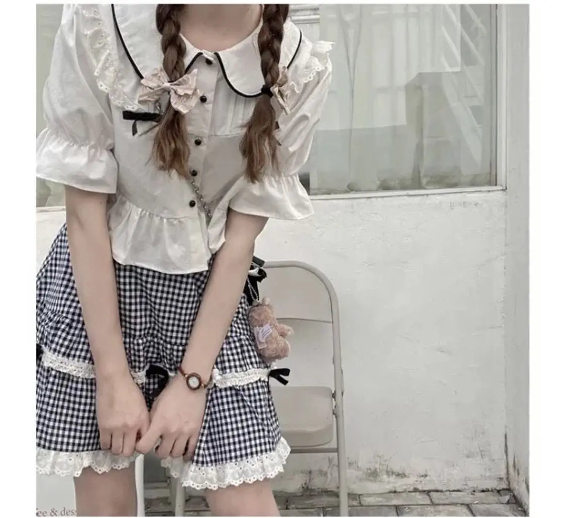Hnewly Kawaii Plaid Women Short Skirt Lolita Ruffle Japanese Style Lace Bow Mini Skirts Cutecore Sweet Pleated Preppy Skirt