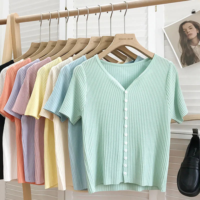 Hnewly Knitted Short Sleeved T-shirt Sweater Women Spring Summer 2025 Thin Loose V-neck Single Breasted Top Solid Short Cardigan Coat