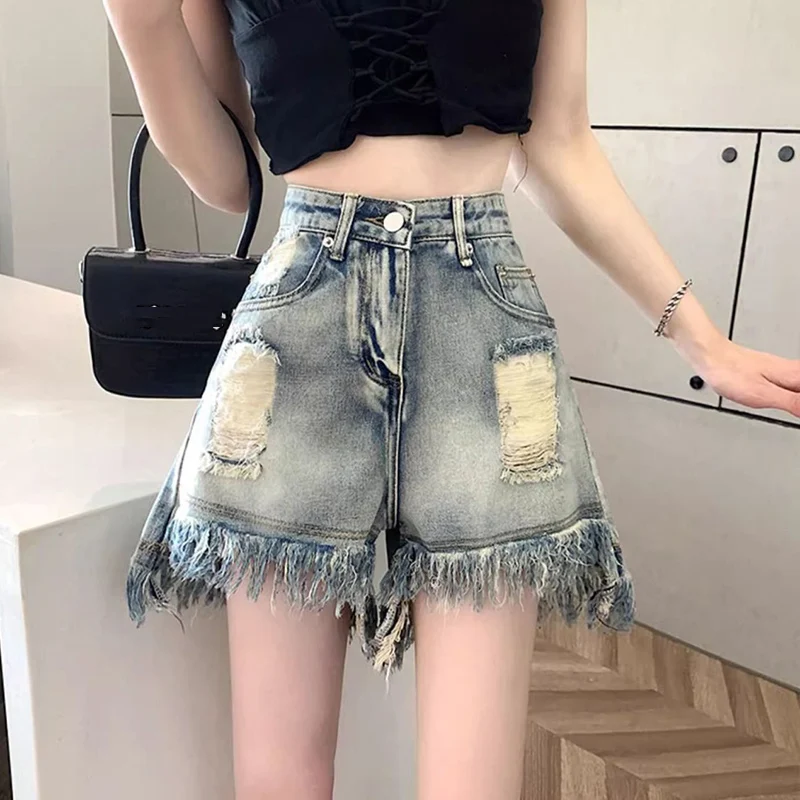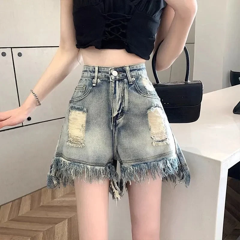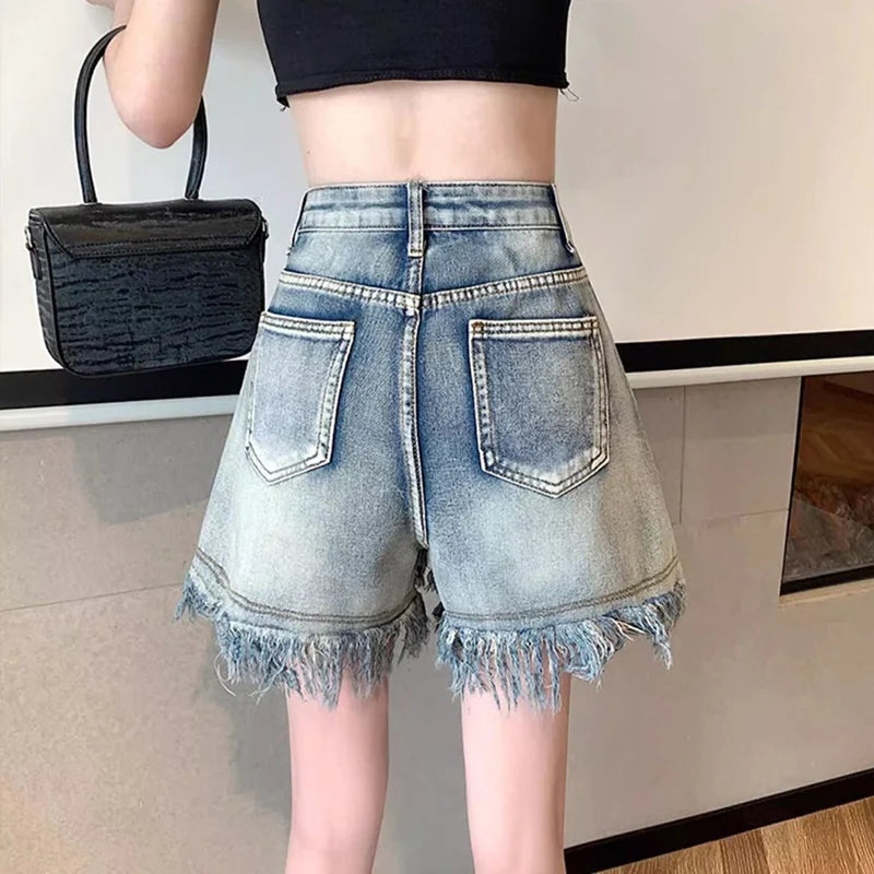 Hnewly Korean Blue Ripped Denim Shorts Women Fashion Summer Tassel Straight Hot Shorts Woman A-Line All Match Short Jeans Female