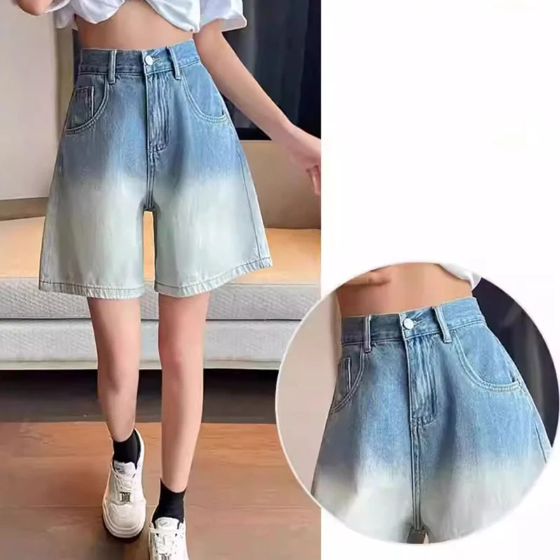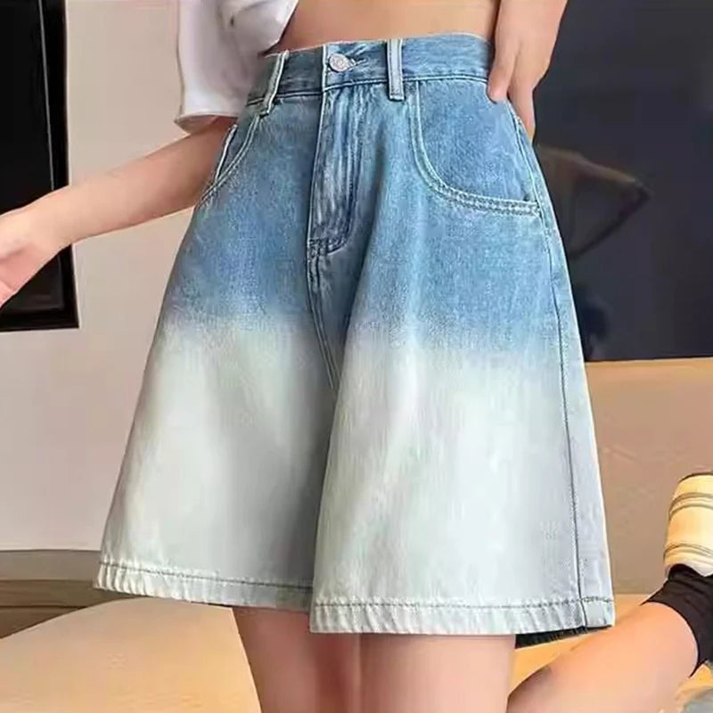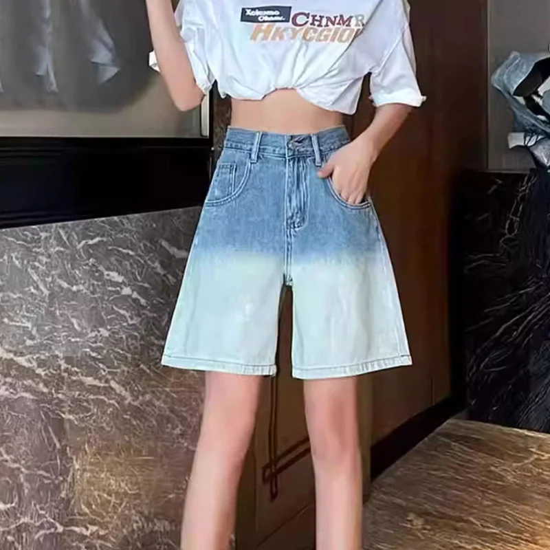 Hnewly Korean Fashion Gradient Denim Shorts Women Summer Wide Leg Knee Length Jeans Woman Streetwear Pocket High Waist Shorts Female