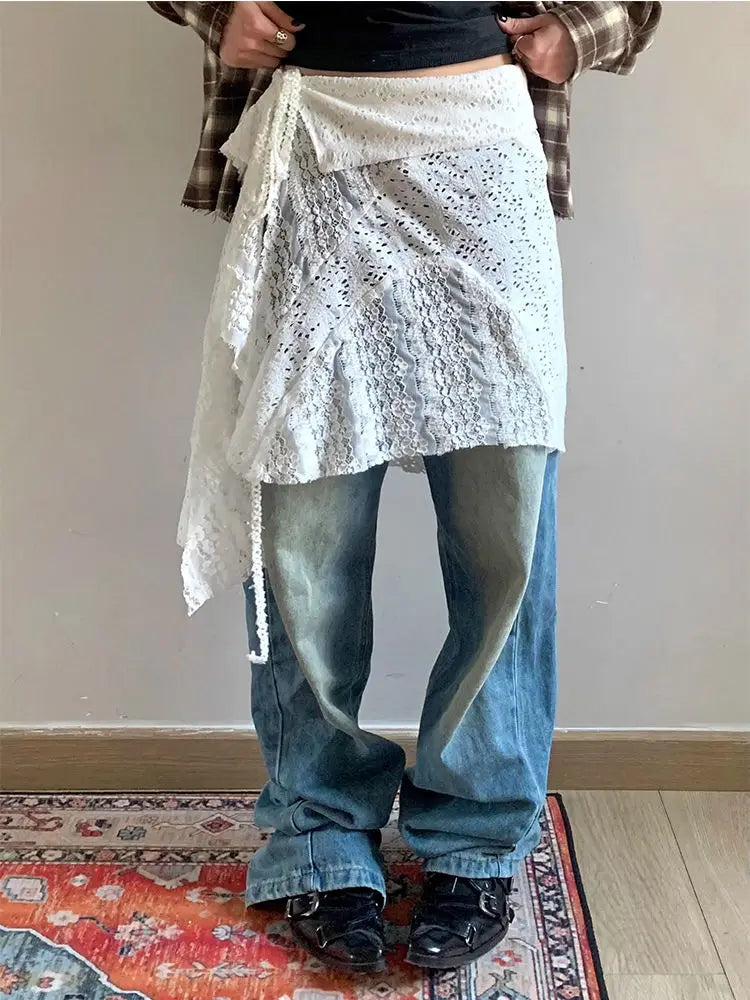Hnewly Korean Fashion Lace All-match Skirt for Women Y2k High Waist White A-line Skirts 2025 Summer New Hollow Out Faldas Mujer