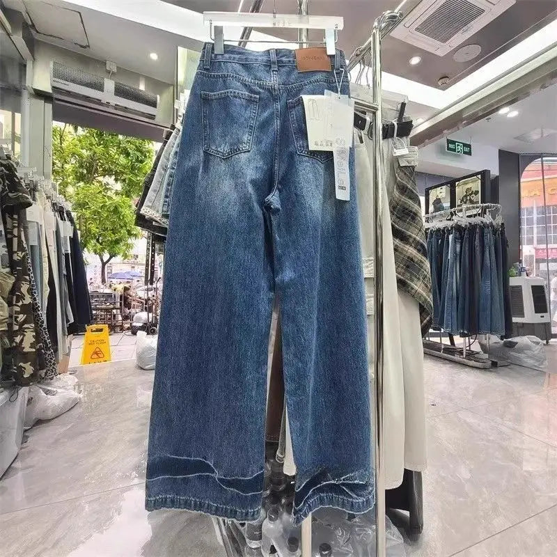 Hnewly Korean Style Fashion Vintage Washed Denim Pants High Waist Irregular Jeans for Women Loose All-match Wide Leg Trousers