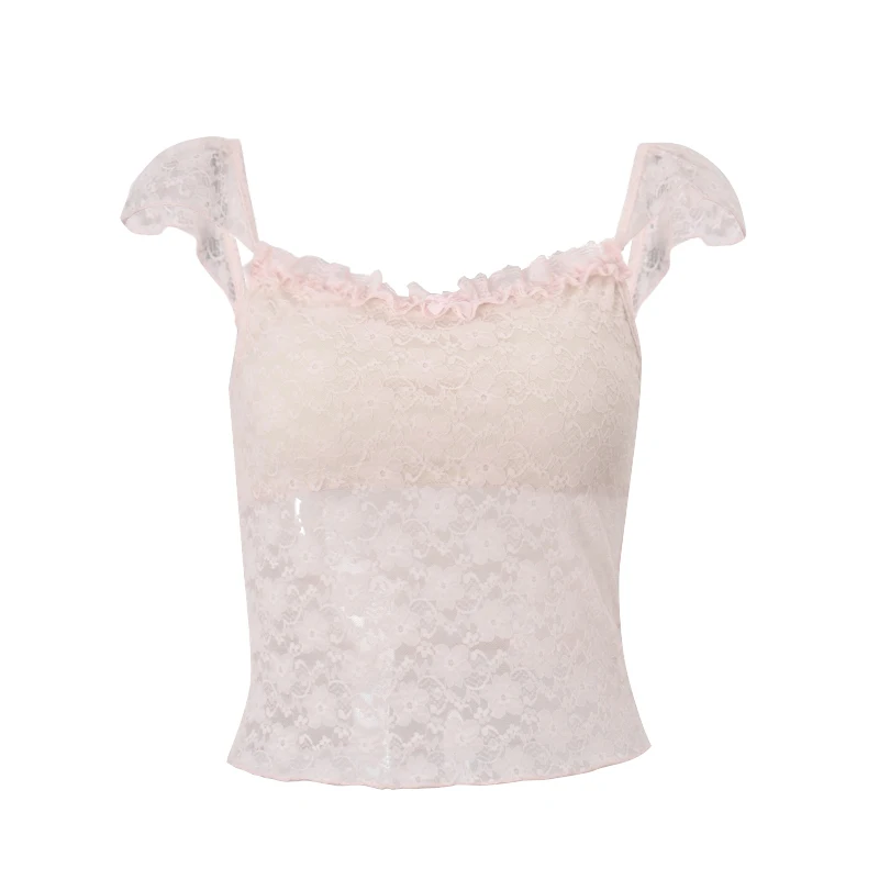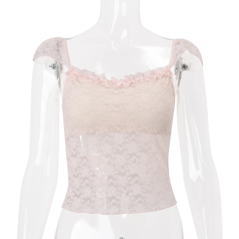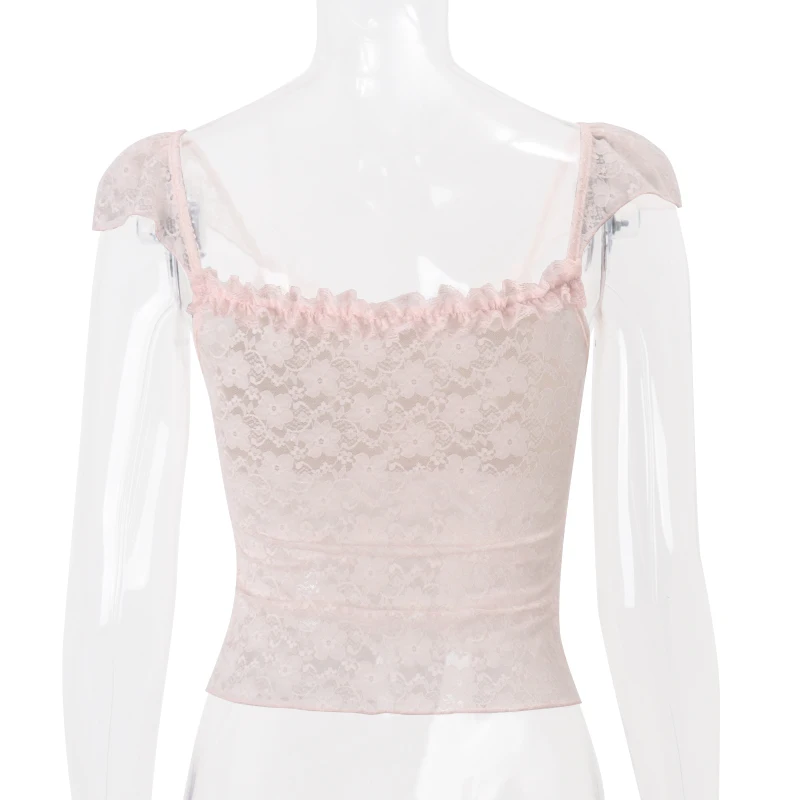 Hnewly Korean Women Off Shoulder Crop Tops Sexy Lace Ruffle Sleeveless Square Neck Vest 2025 Summer Fashion Halter Camisole