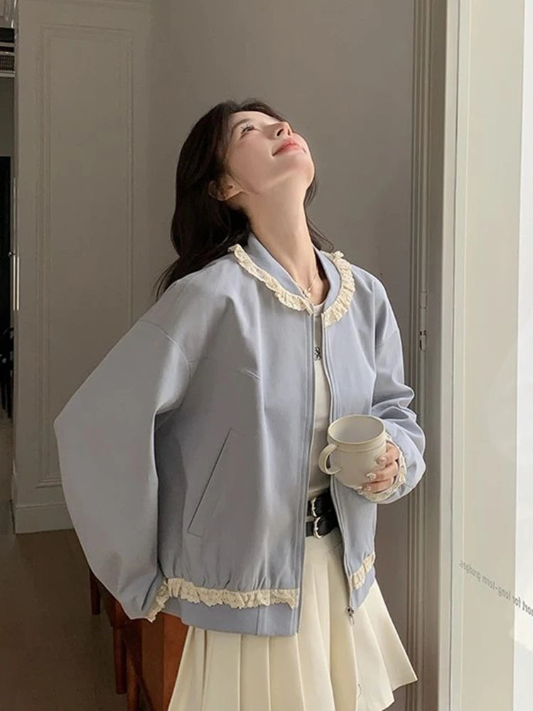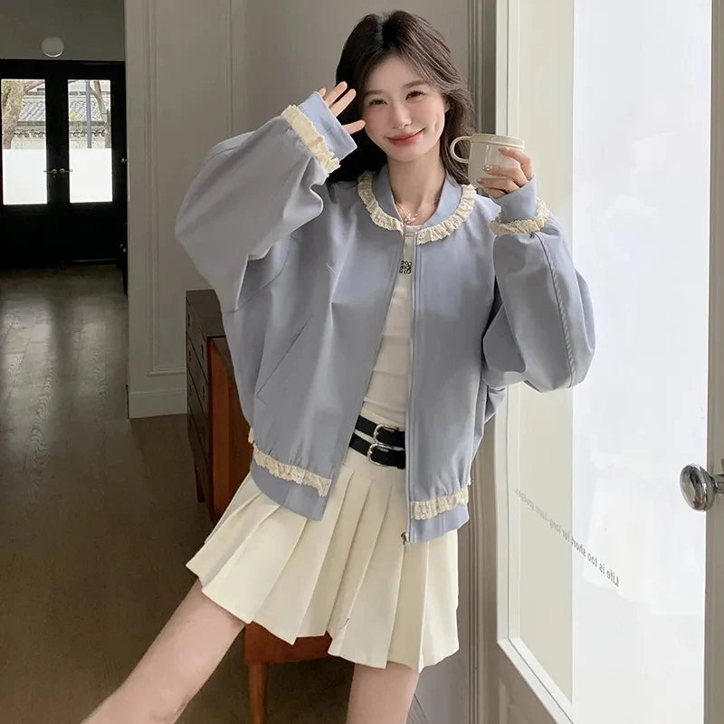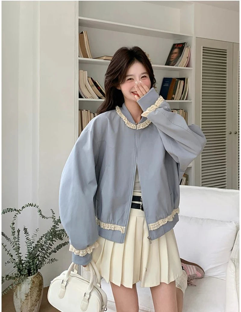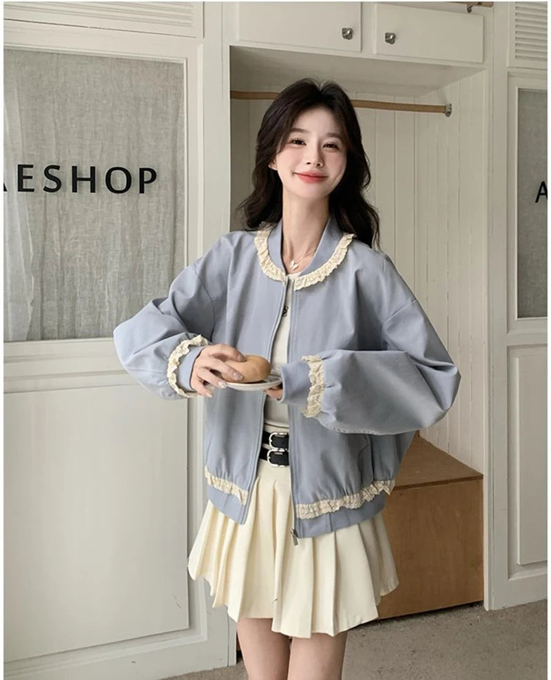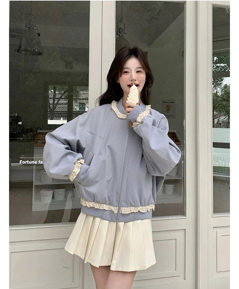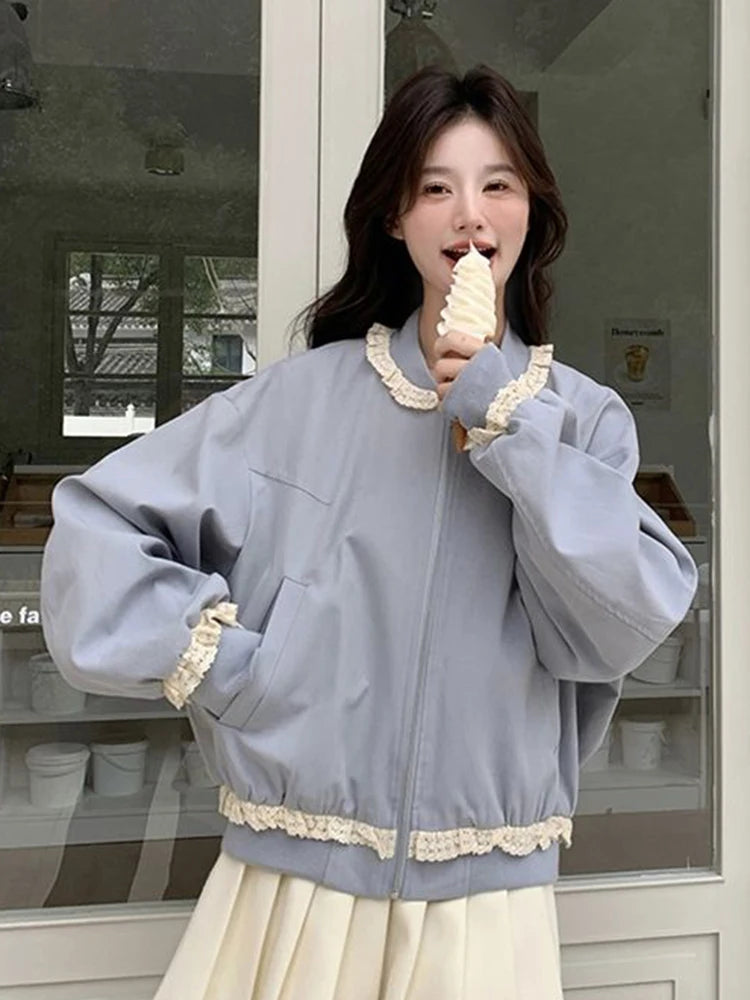 Hnewly Lace Patchwork Sweet Jacket Women Loose Vintage Preppy Style Cute Coat Female Long Sleeve Korean Retro O Neck Tops Outwear