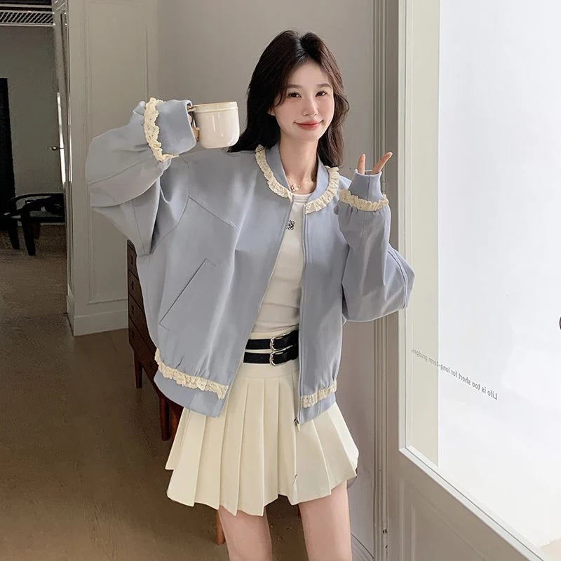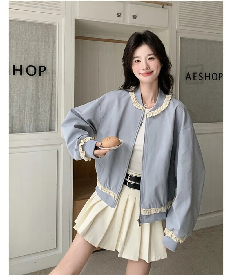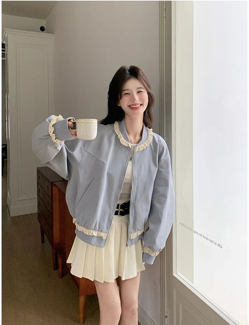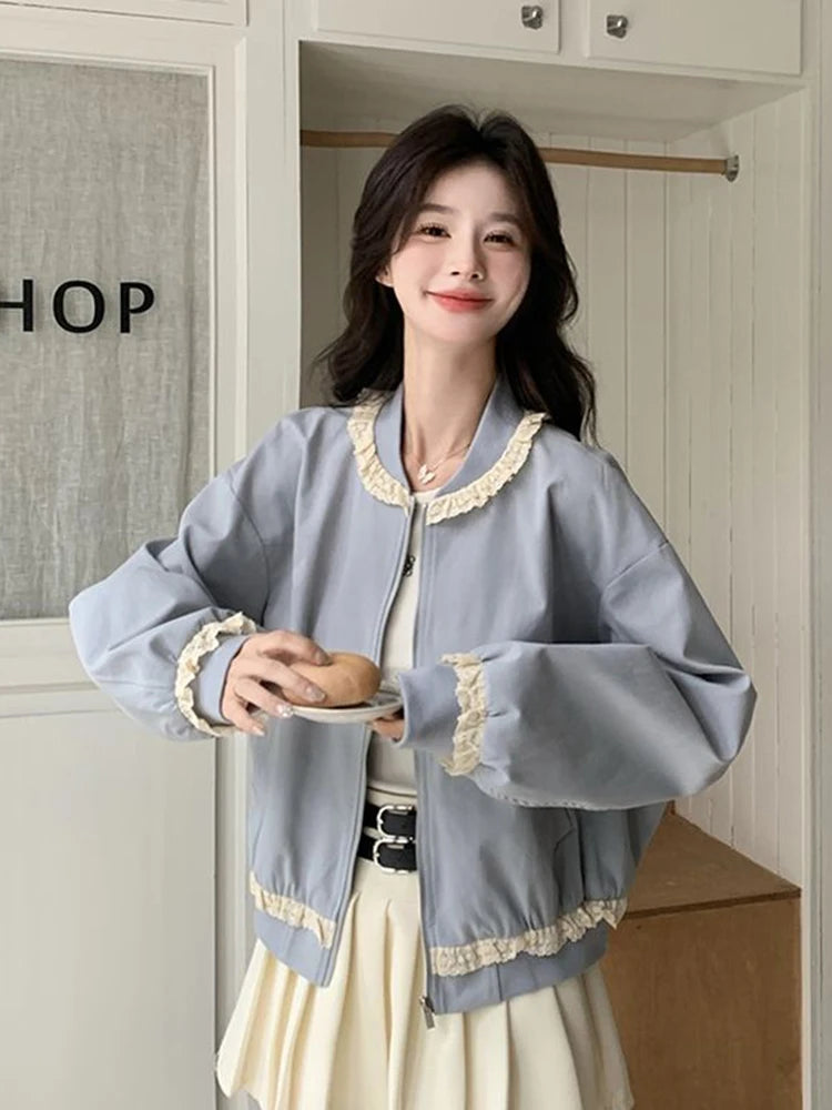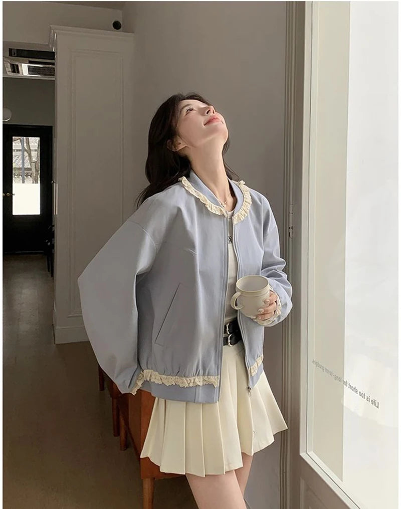 Hnewly Lace Patchwork Sweet Jacket Women Loose Vintage Preppy Style Cute Coat Female Long Sleeve Korean Retro O Neck Tops Outwear