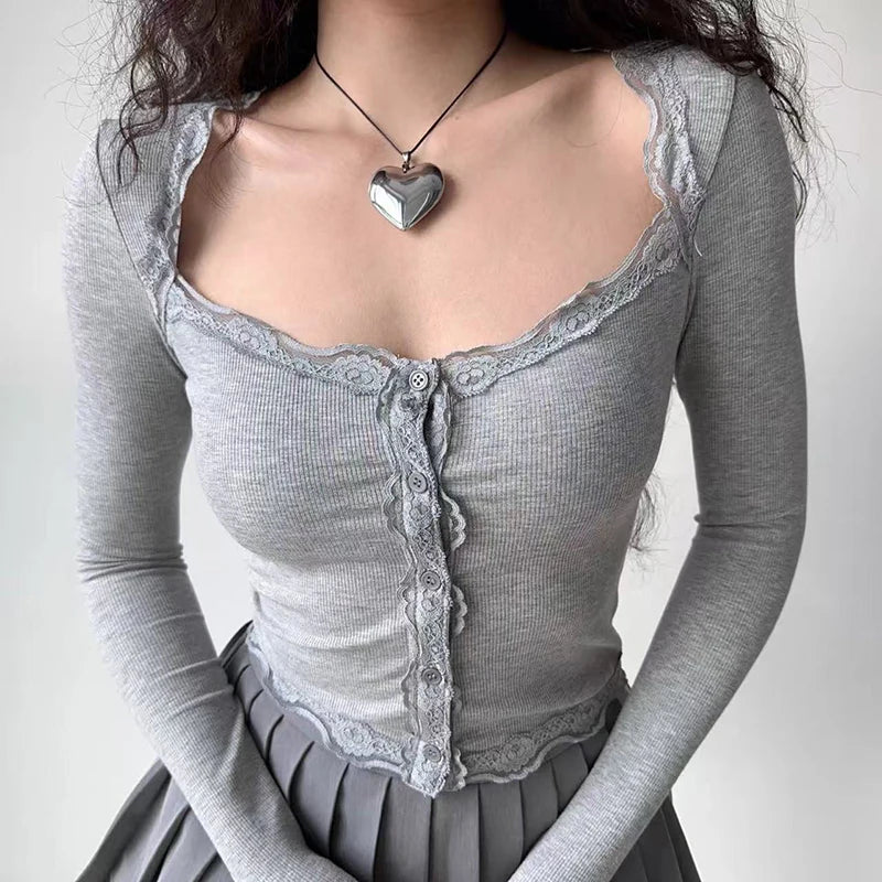 Hnewly Lace Square Collar Knit T Shirt Women Autumn Chic Slim Single Breasted Crop Tops Y2K Streetwear Sexy Hot Girl Long Sleeve Tees