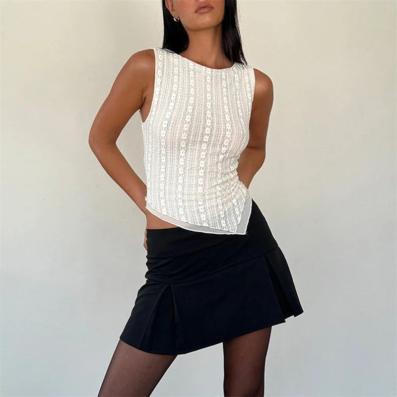 Hnewly Lace Tank Top y2k Clothes Women Sheer Floral Round Neck Sleeveless Asymmetrical Hem T Shirt 2000s Clothing Streetwear