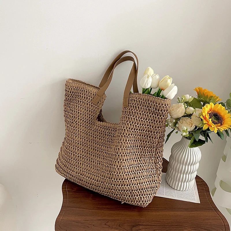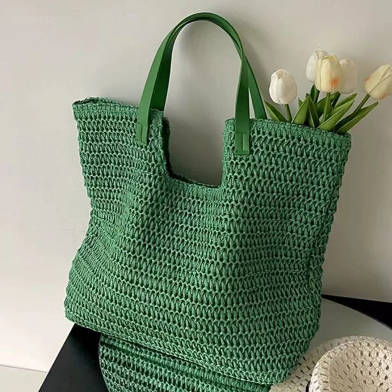 Hnewly Large Capacity Woven Bag New Fashion Commuting Tote Handbag Female Niche Shoulder Knapsack Beach Grass Bags