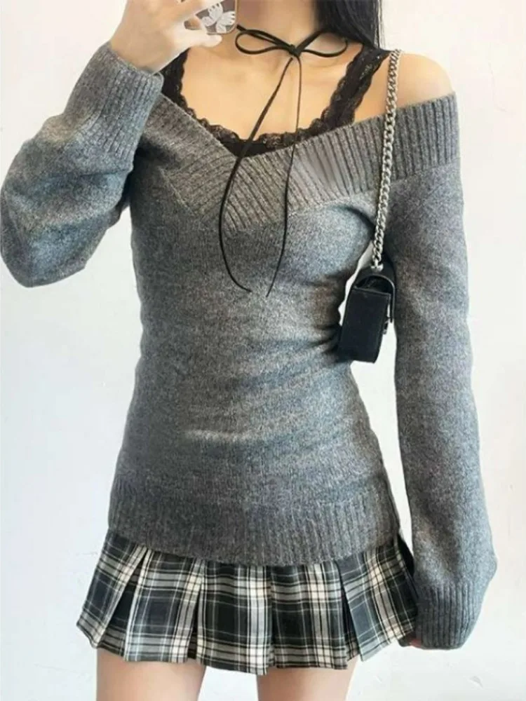 Hnewly Lazy Retro V-neck Off Shoulder Sweater for Women Autumn Winter New Knitted Tops Mujer Y2k Slim Fit Long Sleeve Pullovers