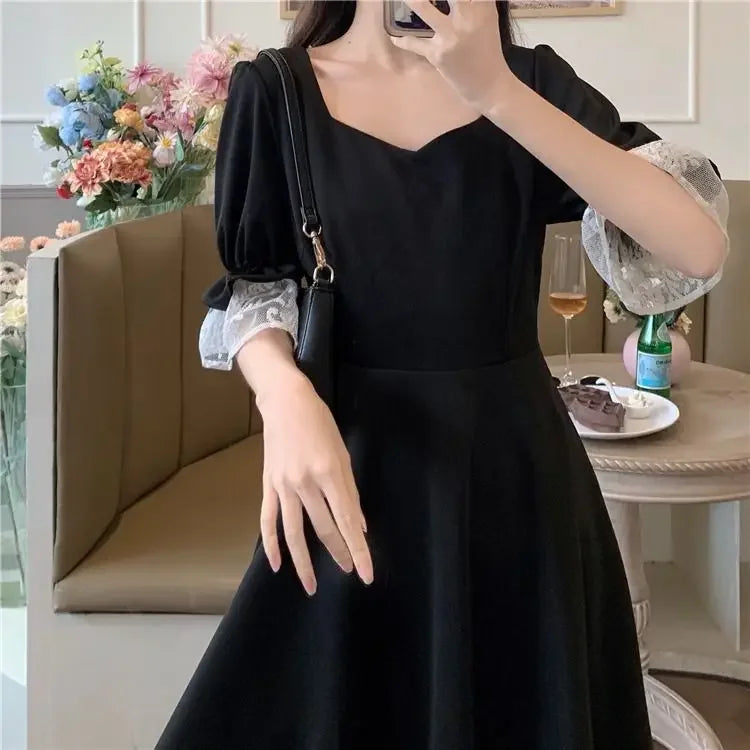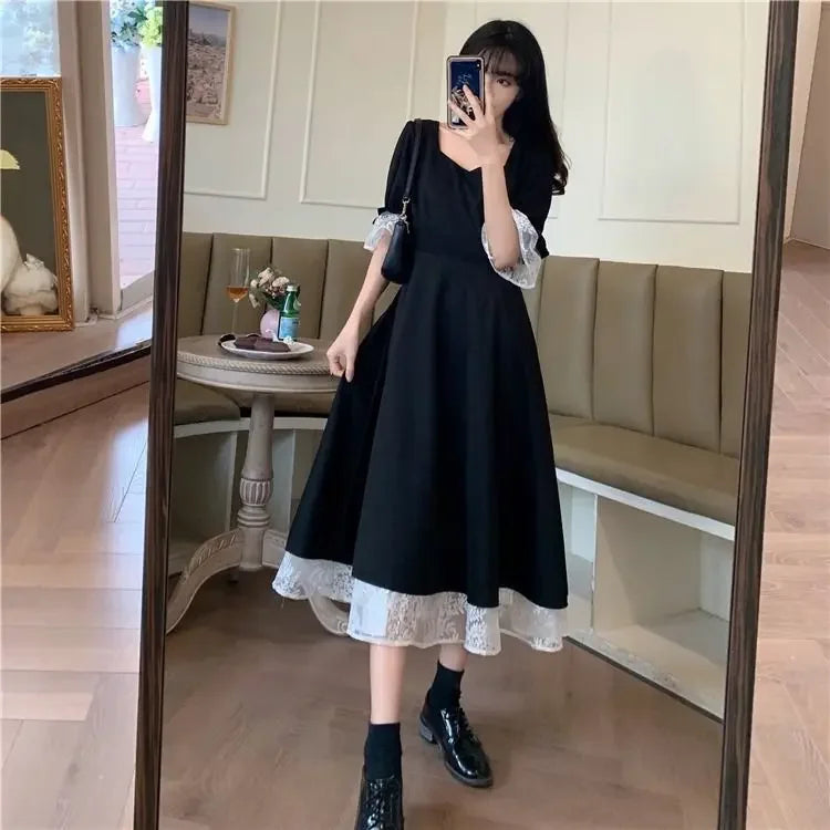 Hnewly Lolita Unique Large Size Black Dress Women's New Style Hepburn Style Korean Daisy Lace Long Skirt Midi Dress