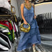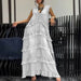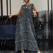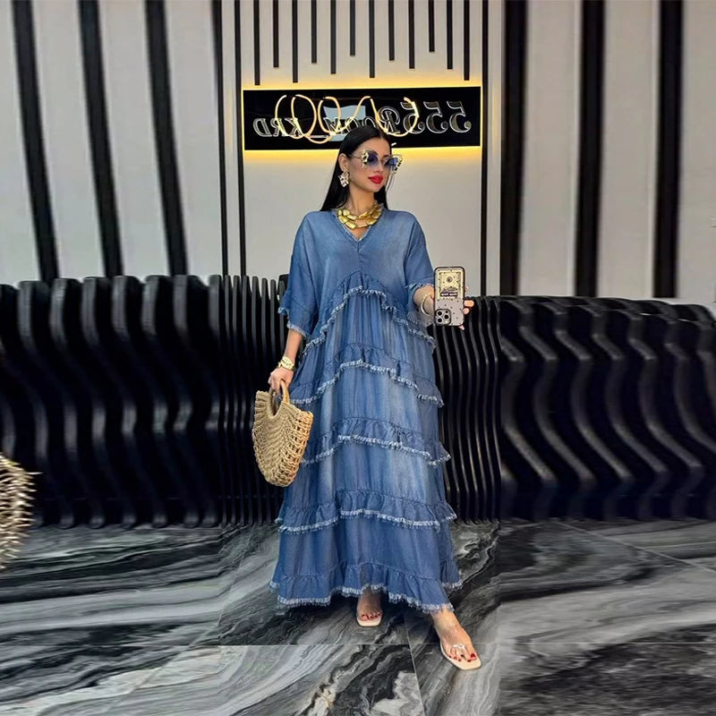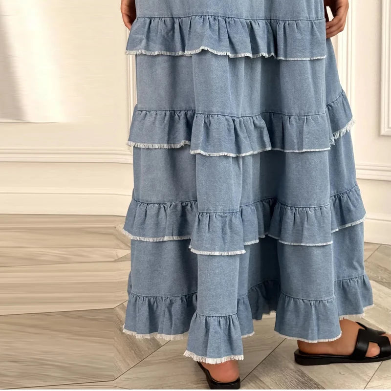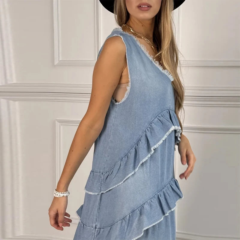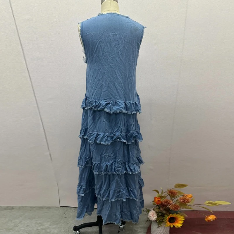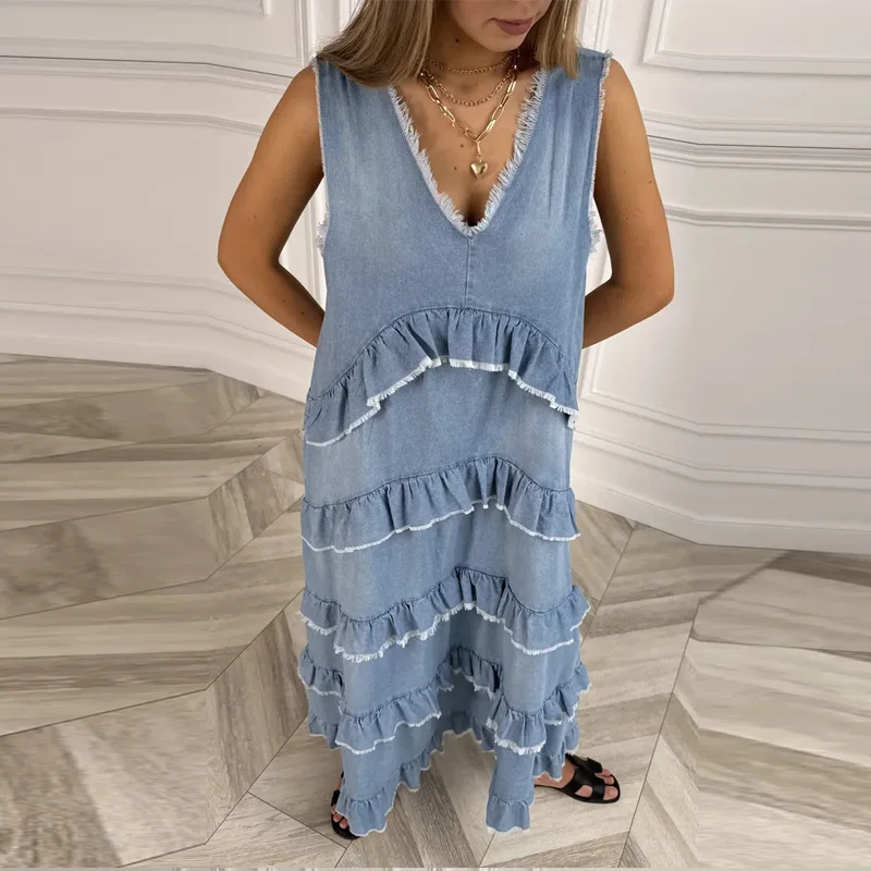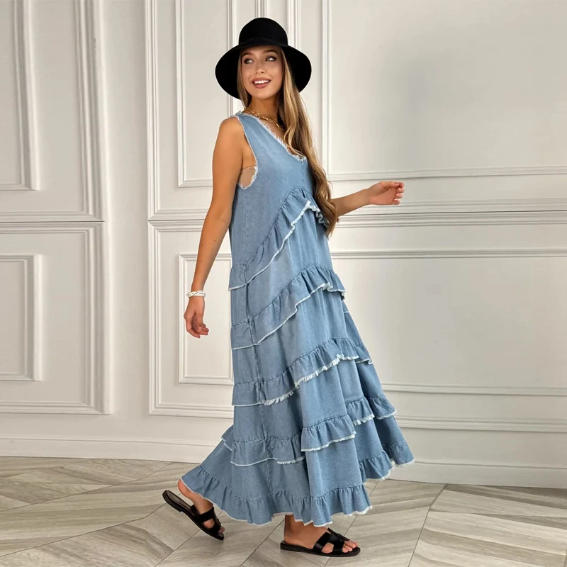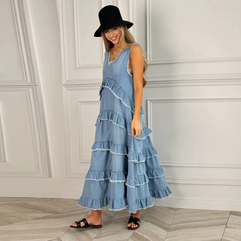 Hnewly Loose Ruffles Edging Denim Long Dress Women Casual V-neck Sleeveless Female Cake Dresses Summer Lady Fashion Vacation Robe