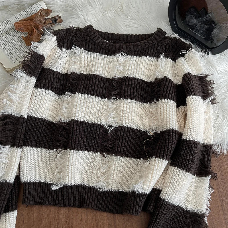 Hnewly Loose Stripe Hole Knitted Sweater Women's 2025 Autumn Winter New Retro Japanese Short Pullover Tassel Versatile Tops