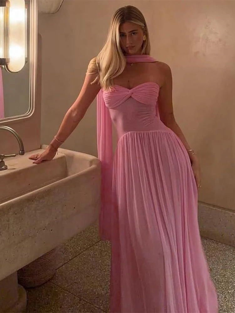 Hnewly Mesh Patchwork Maxi Dress Women Solid Scarf+Sexy Backless Strapless Ruffles Midnight Banquet Party Elegant Outfits
