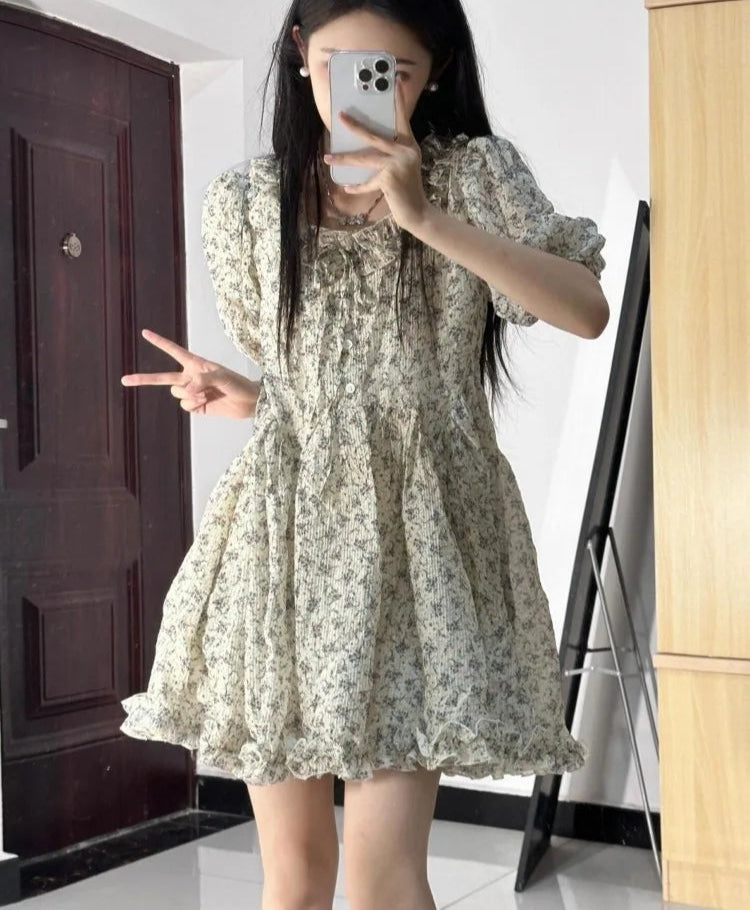 Hnewly Mini Dresses Women Floral Printed Short Sleeve V Neck Puff Short Sleeve Bandage Ruffles Sweet Dress Female Elegant Casual
