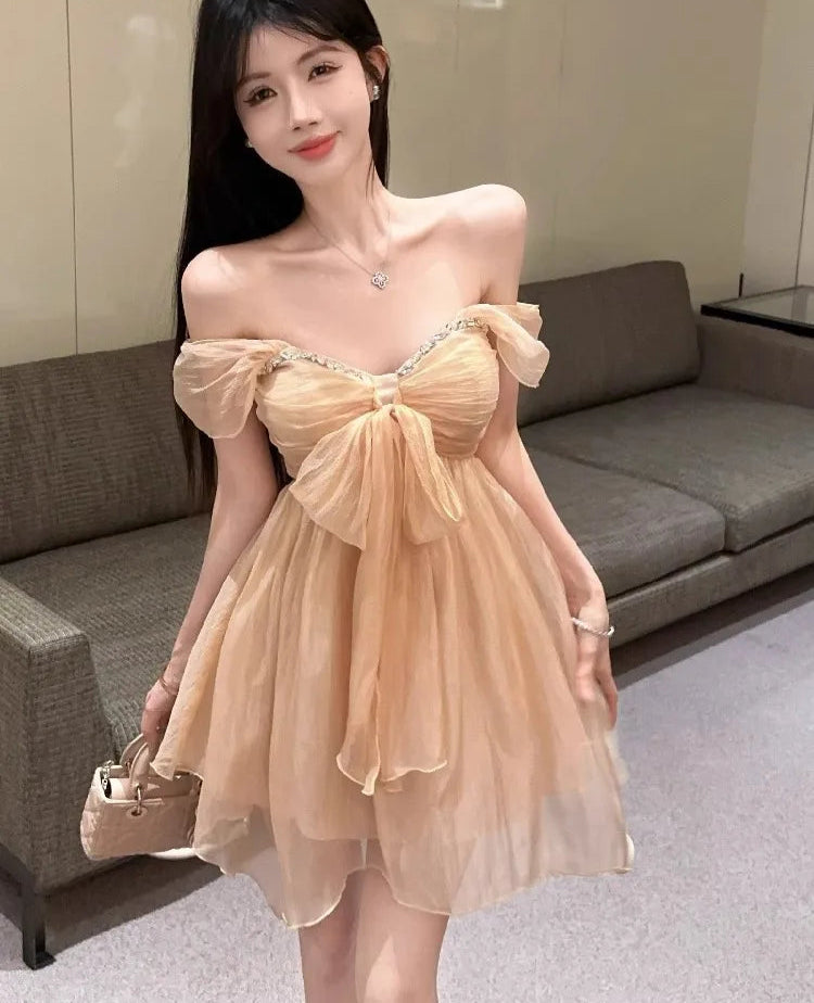 Hnewly Mini Dresses Women Rhinestone Off Shoulder Bow Slim Backless Irregular Solid Backless Party Dress Elegant Ladies Sweet