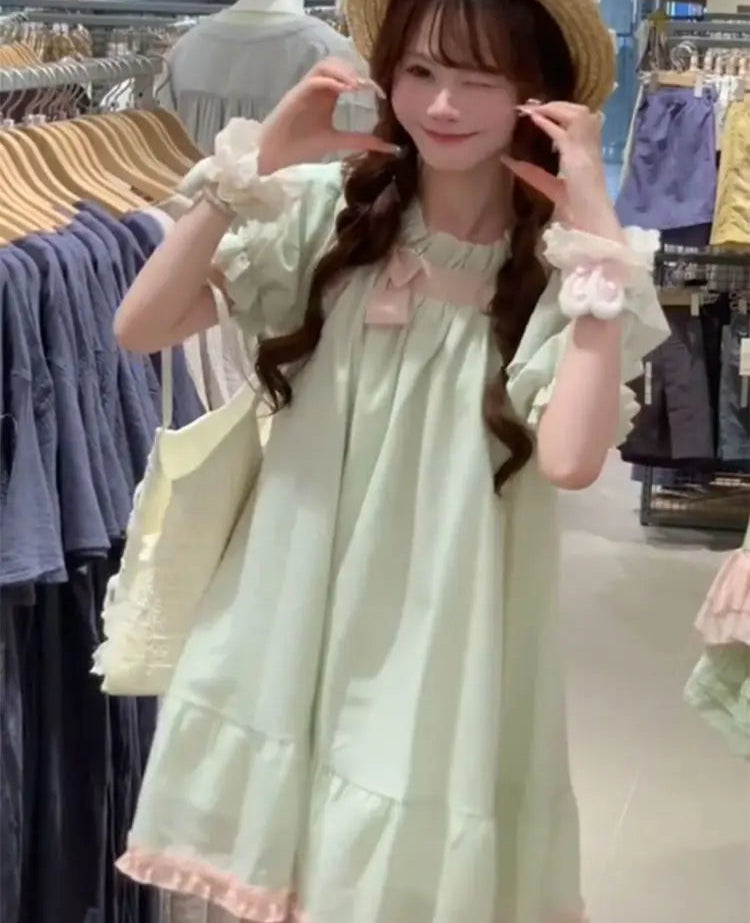 Hnewly Mini Dresses Women Sweet Bow Ruffles Patchwork Puff Short Sleeve Summer Fashion Casual Party Dress Princess Casual