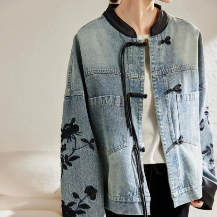 Hnewly New Chinese Style Stand Collar Denim Jackets Spring Embroidery Coat Women Y2k E-Girl Long Sleeve Loose Tops Mujer