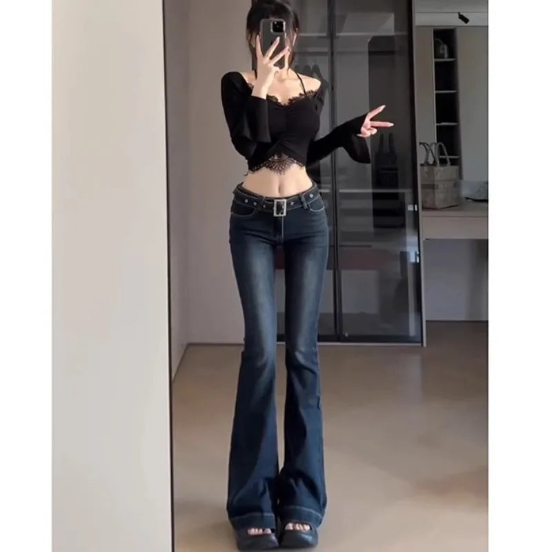 Hnewly New Flare Jeans Women's Low Waist Trousers Vintage Aesthetic Denim Pants Streetwear Mom Casual Korean Fashion Y2k Jeans