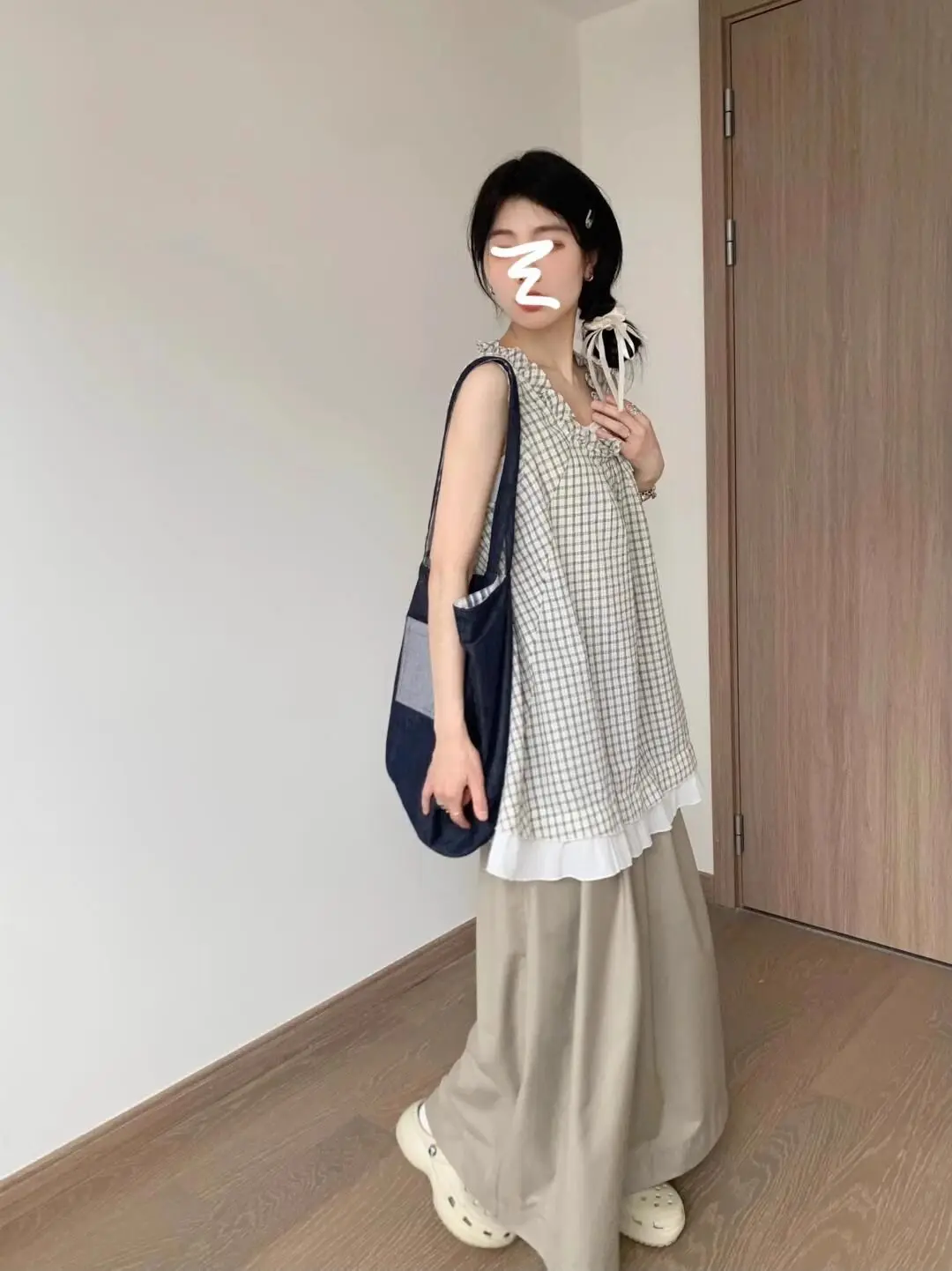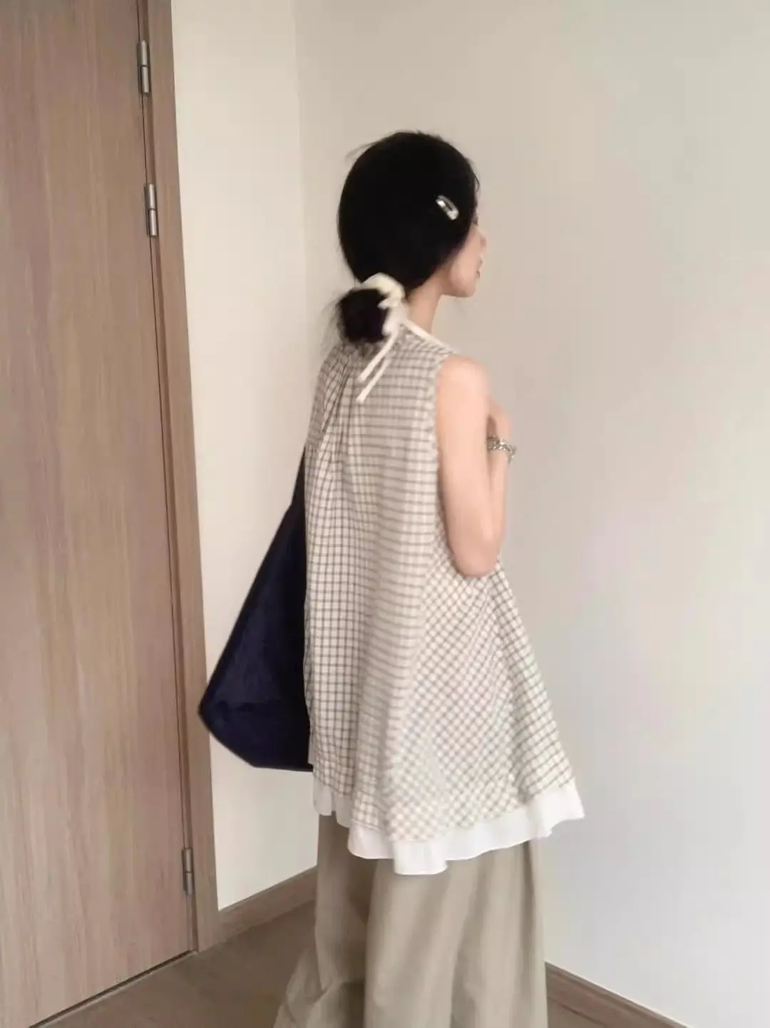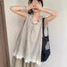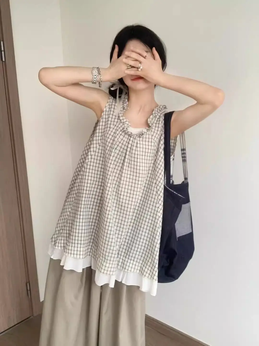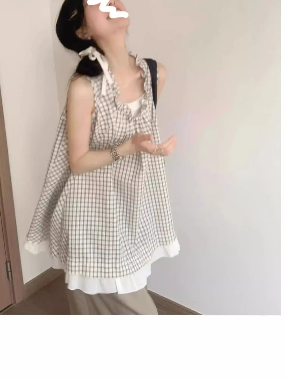Hnewly New Reduced Aging Checkered Fake Two Piece Sleeveless Splicing Summer Lace Sweet Loose Strap Top Tank Top