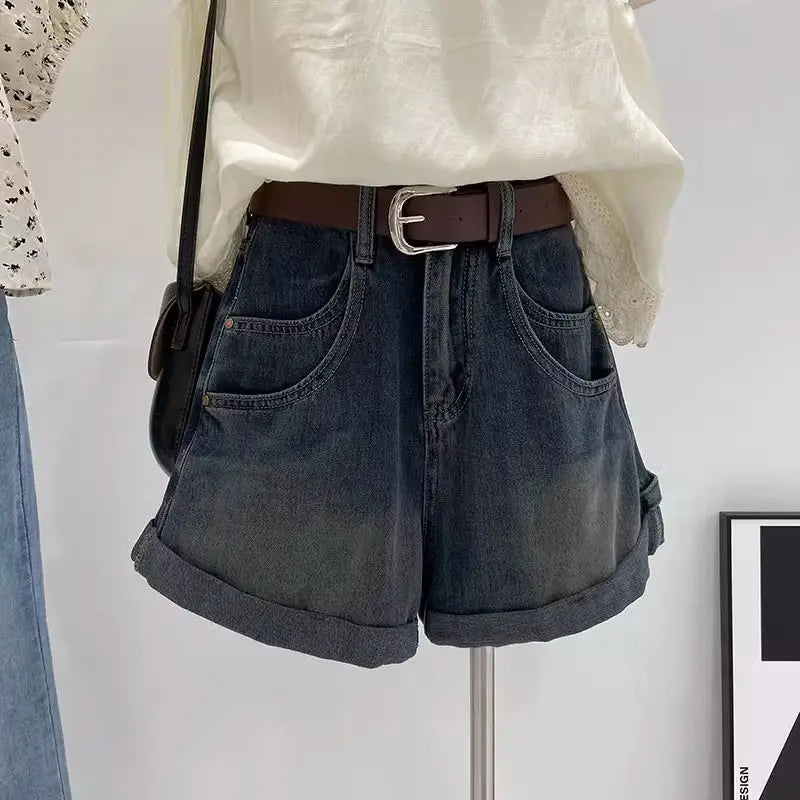 Hnewly New Retro Rolled Denim Shorts 2025 Women's High Waisted Loose Straight Leg A-line Wide Leg Pants Chic Pocket Hot Jean Pants
