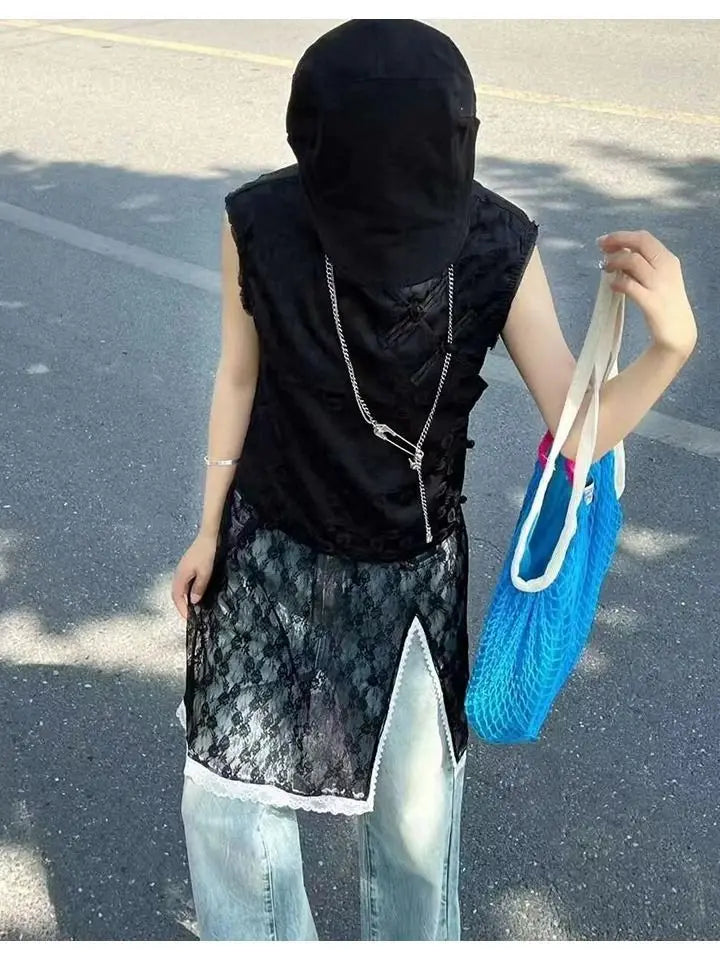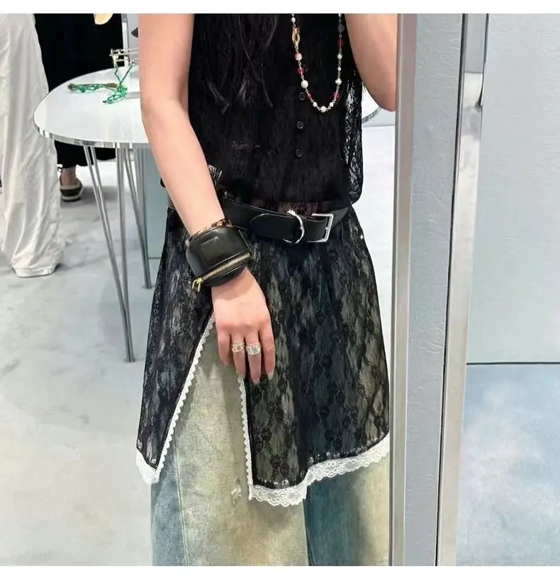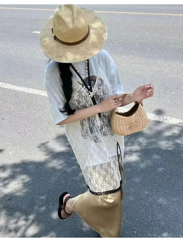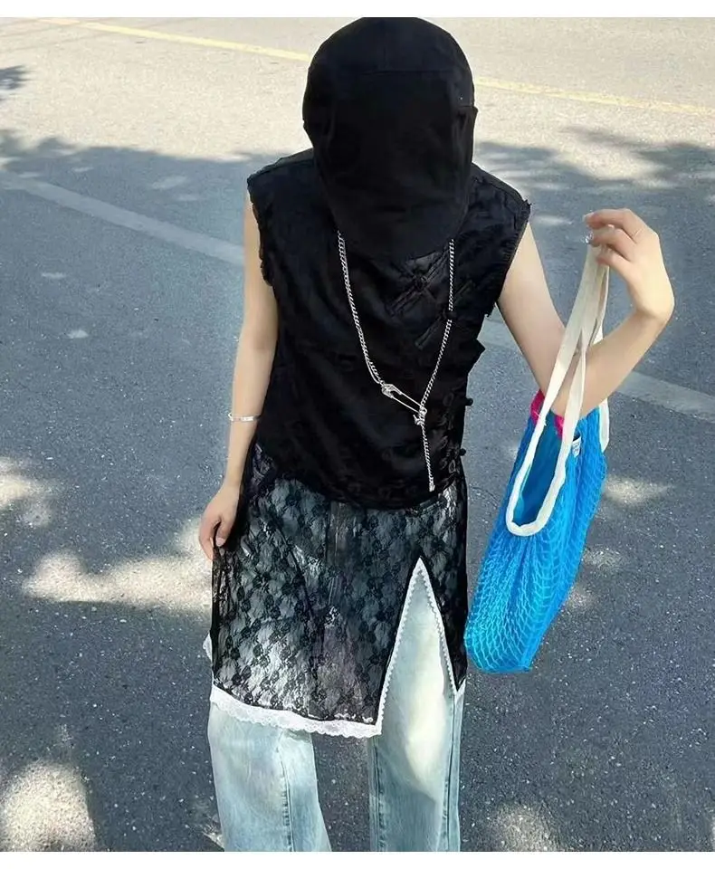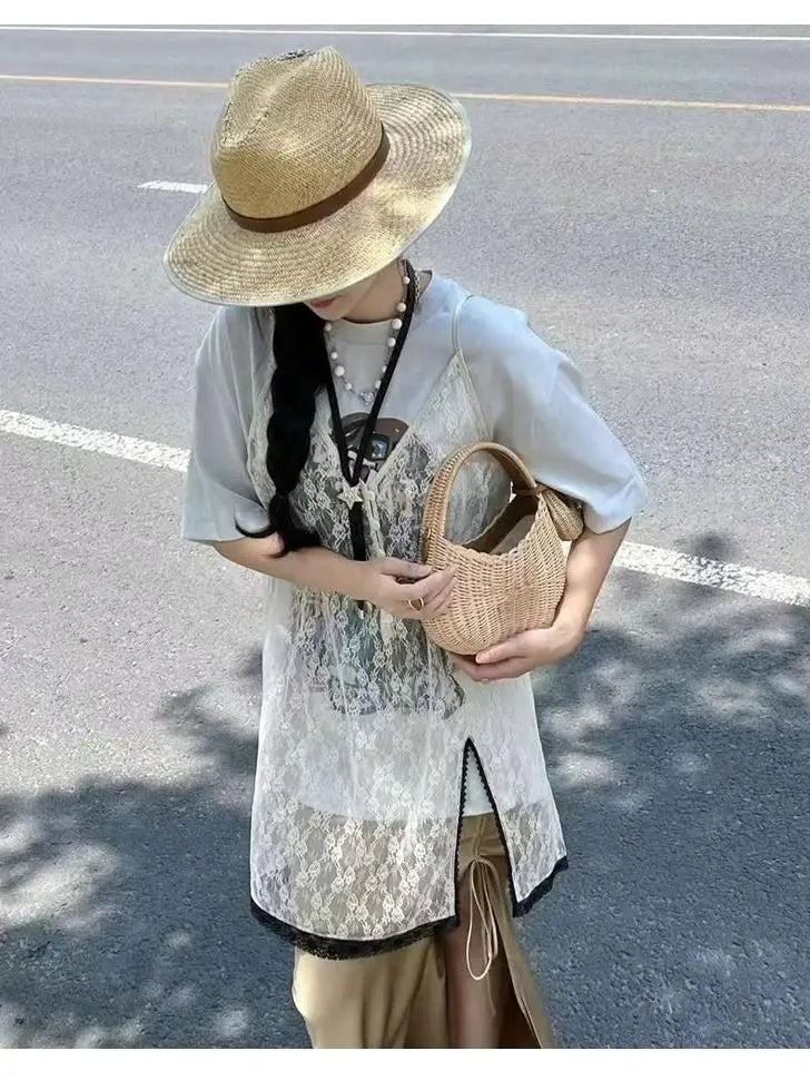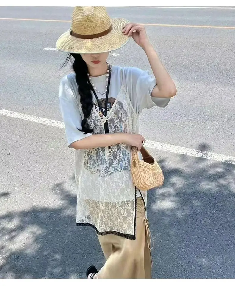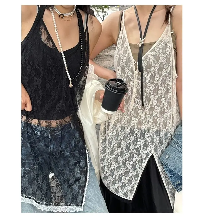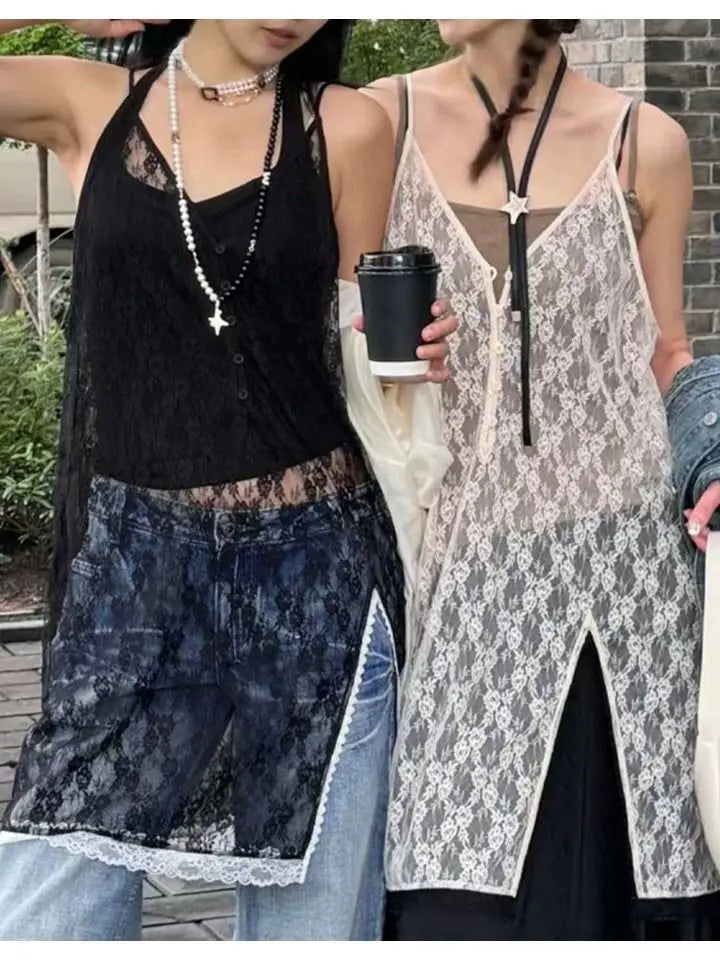 Hnewly New Strap Transparent Mesh Split Dress Stacked