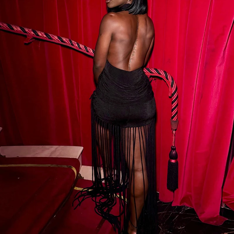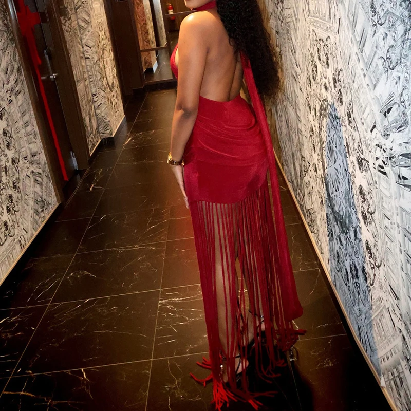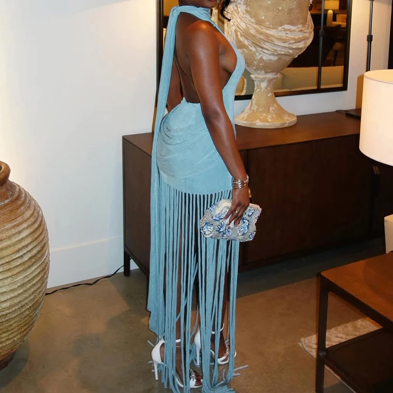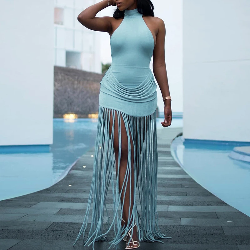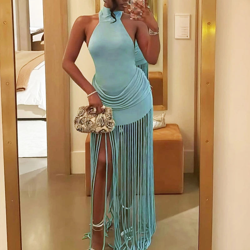 Hnewly New Vacation Backless Dresses Fashion Summer Neck Hanging Slim Long Dress Tassel Patchwork Sleeveless Nightclub Party Dress