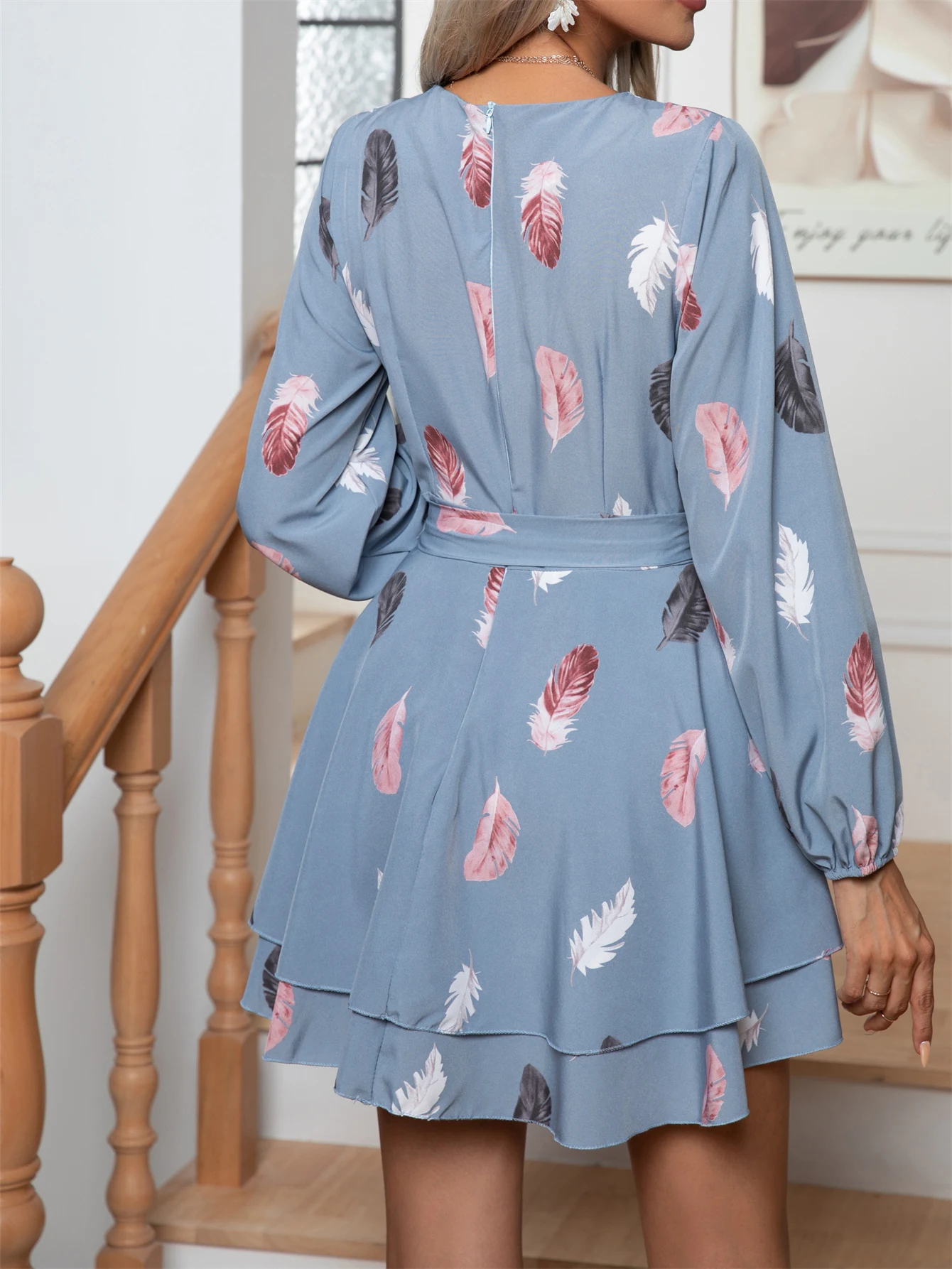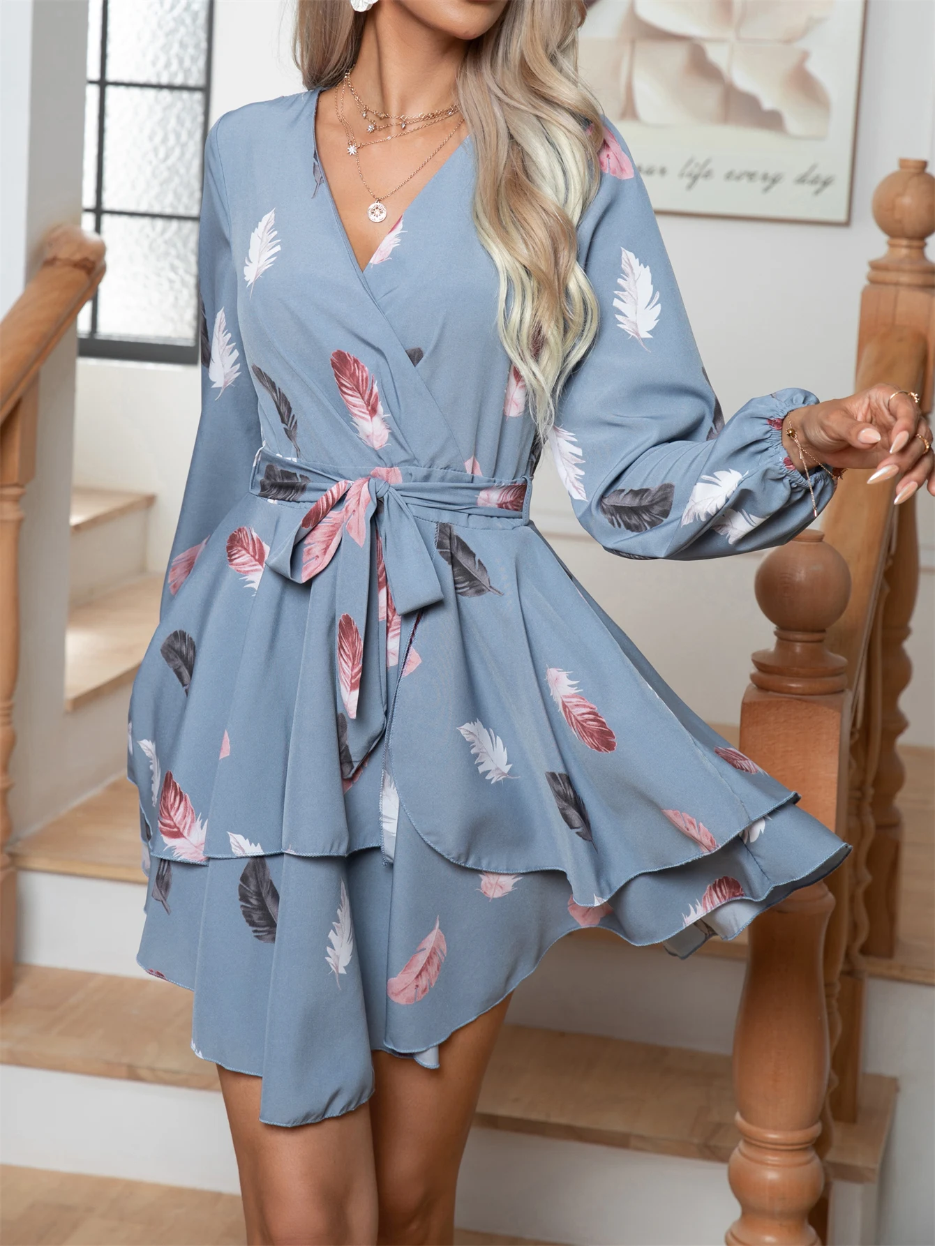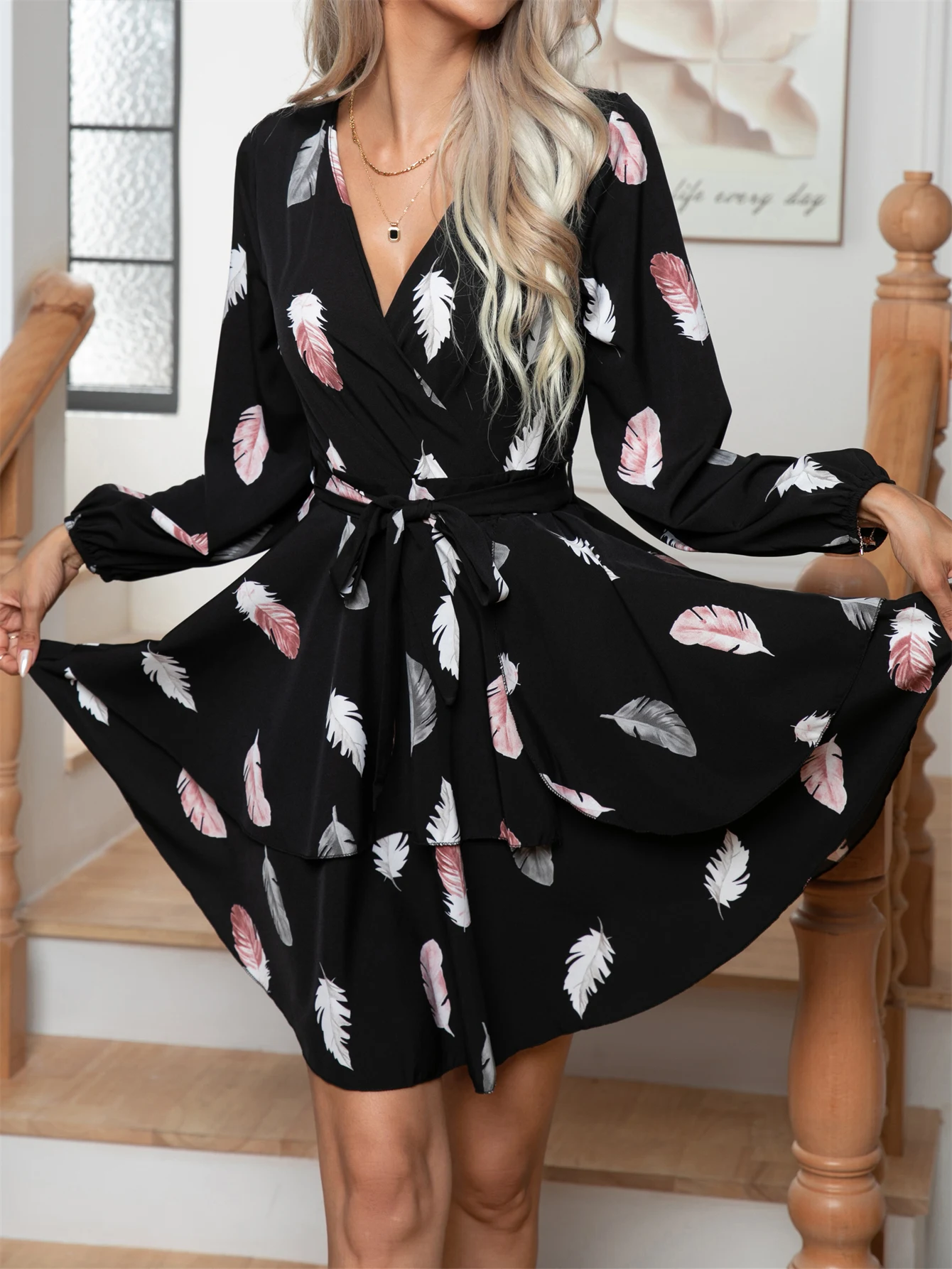 Hnewly New Women Casual Cross V-neck Feather Printed Ruffle Lace Up Multi-layer Hem Long Sleeved Dress