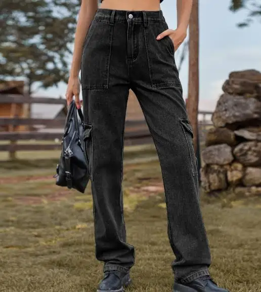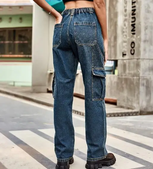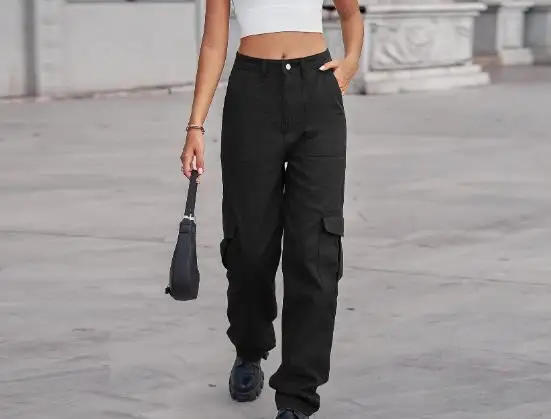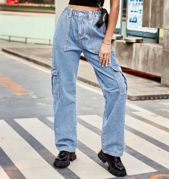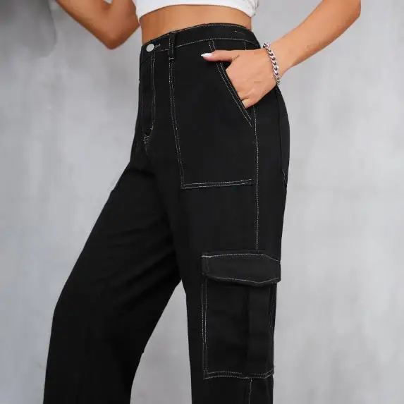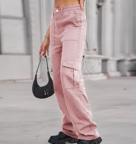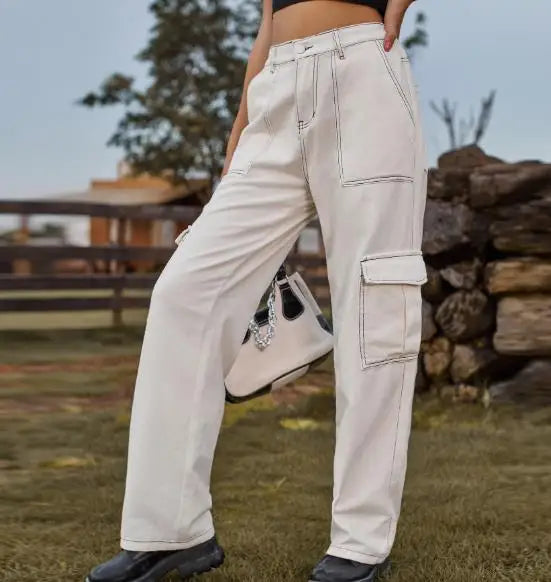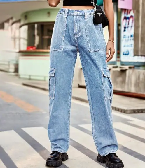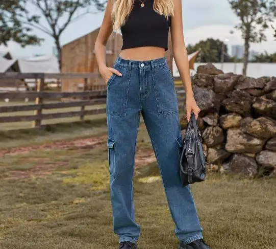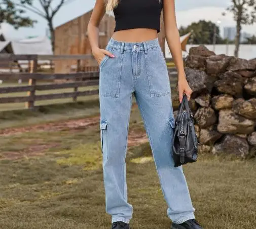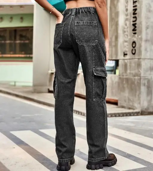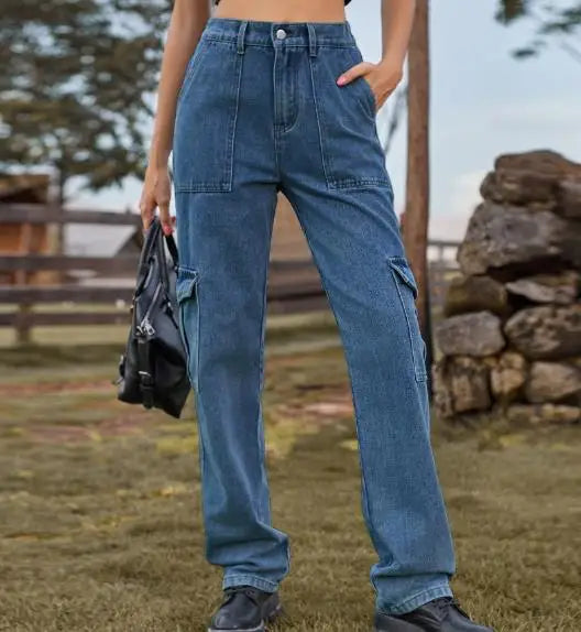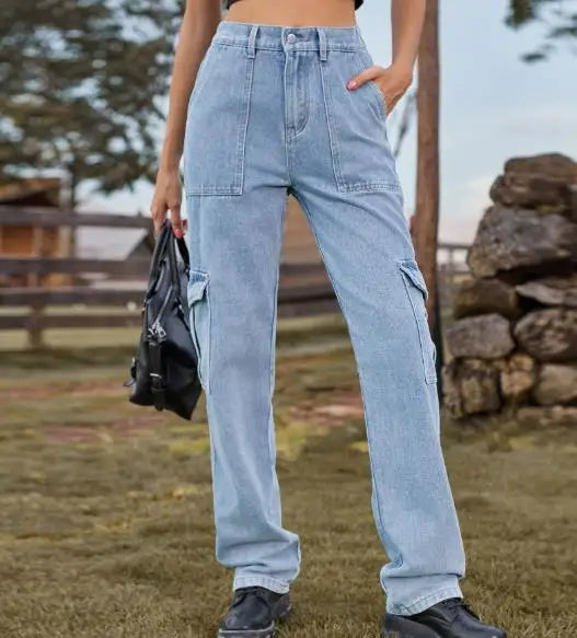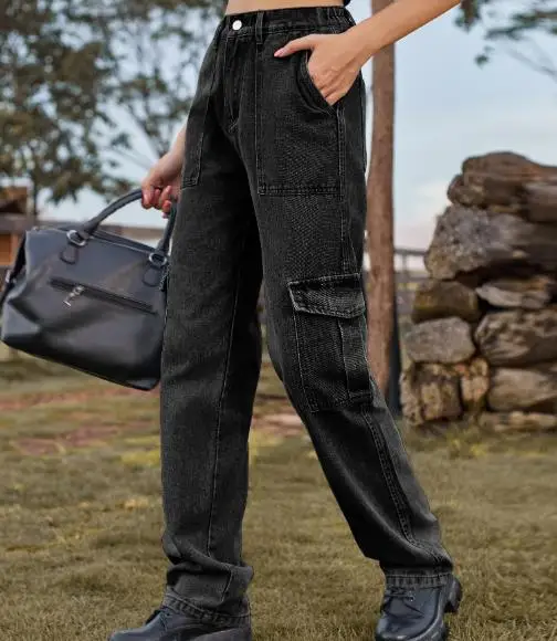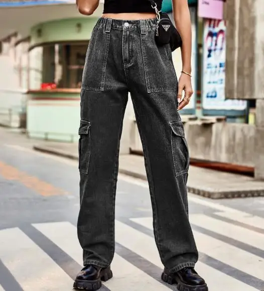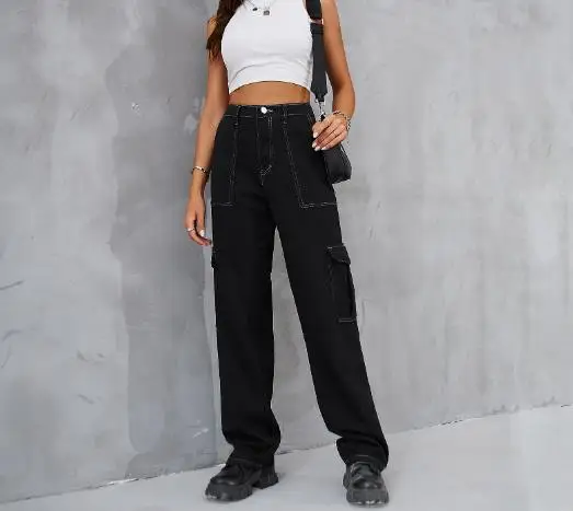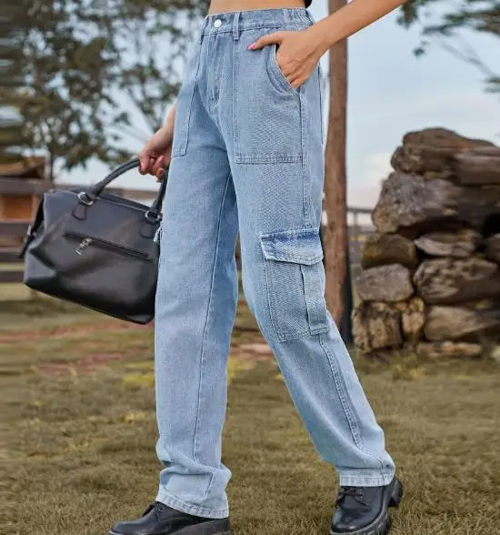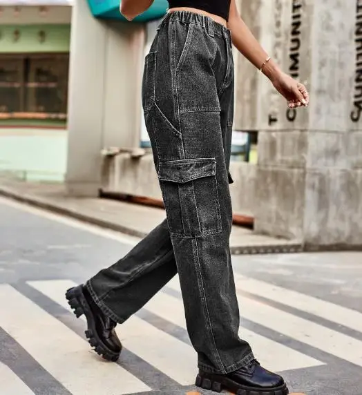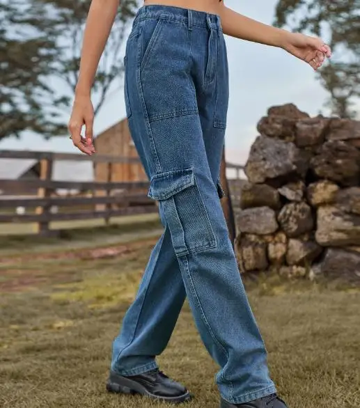 Hnewly New Women's Cargo Wide Leg Pants Pocket Detail and Relaxed Fit Design Casual Fashion Bottoms for Street Wear Denim Pants