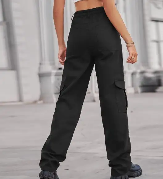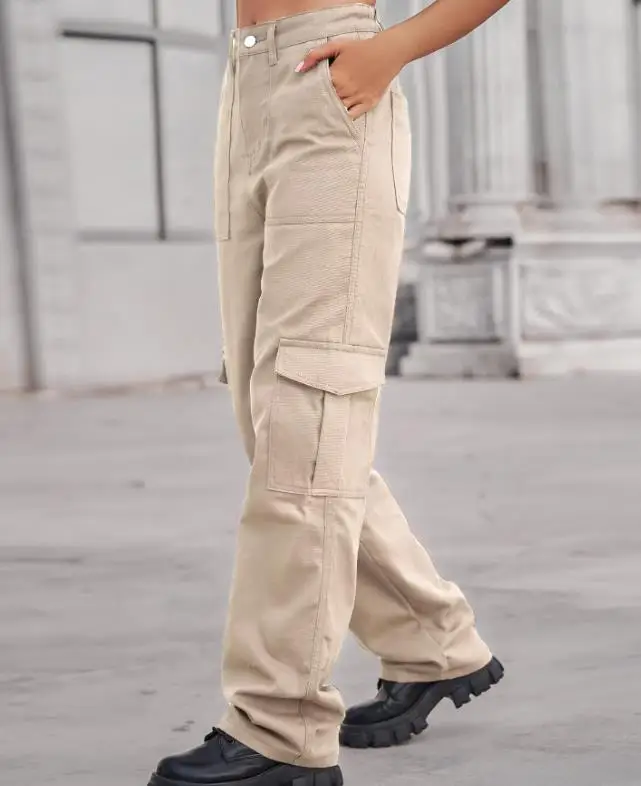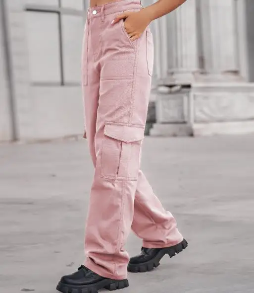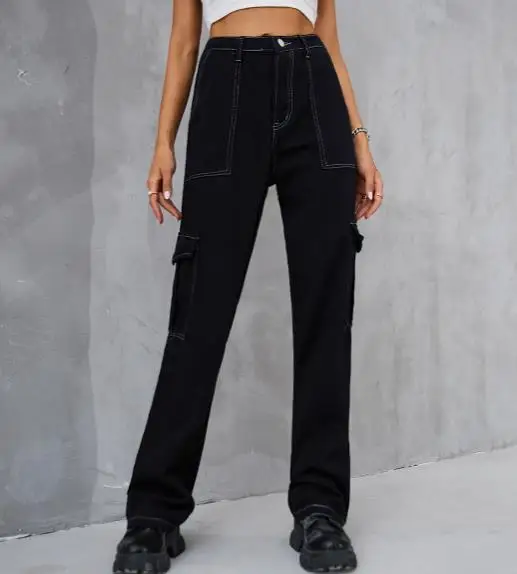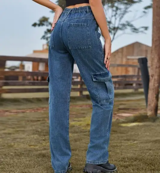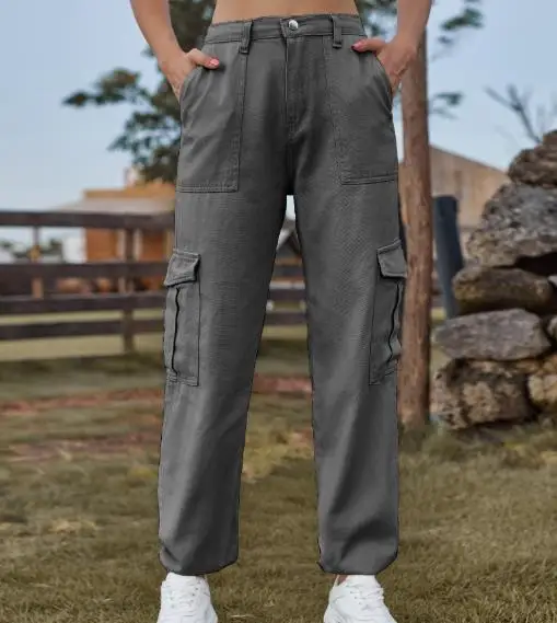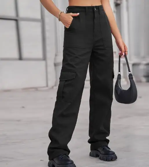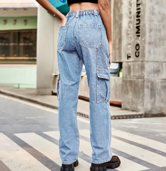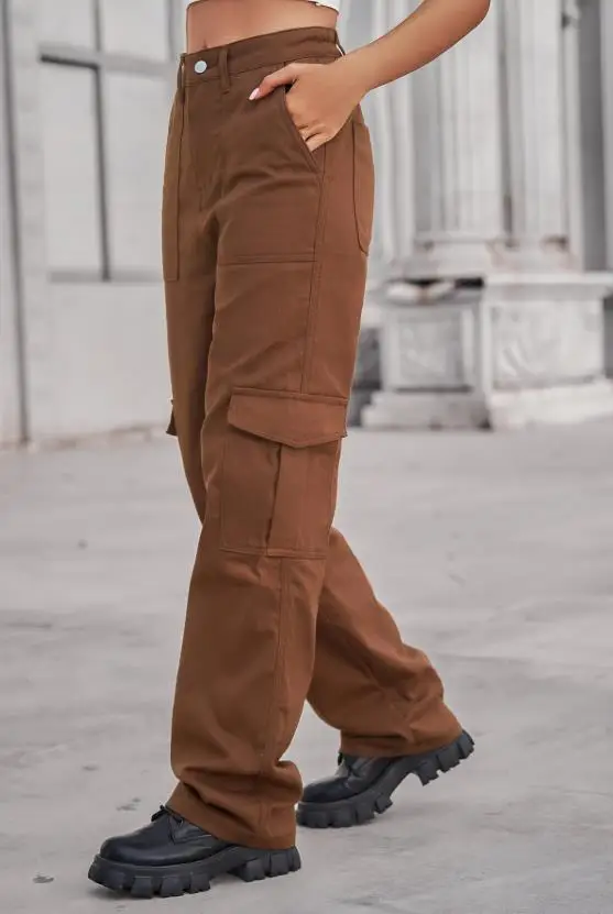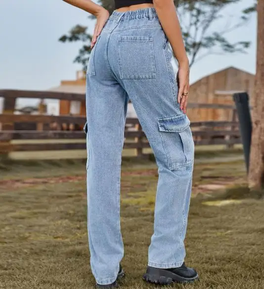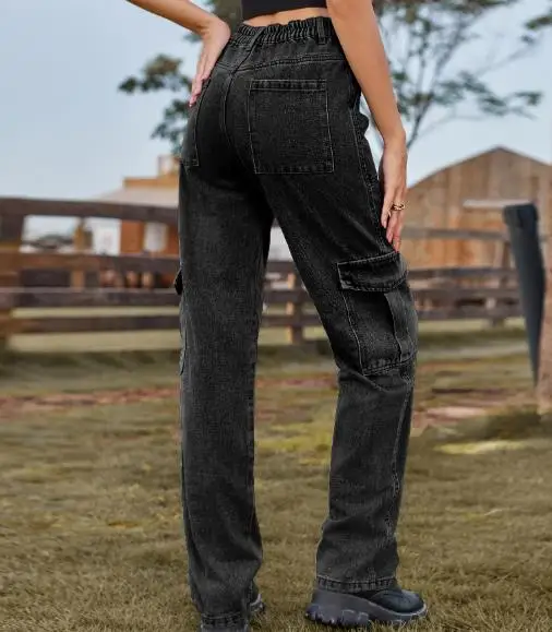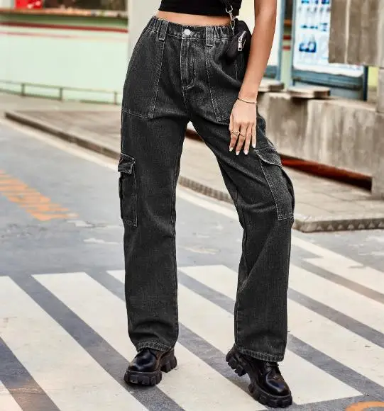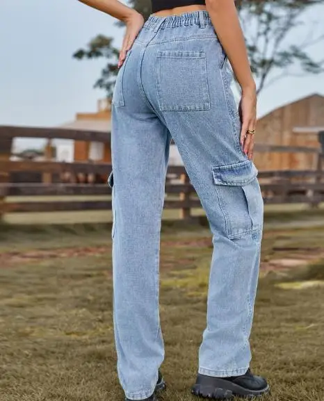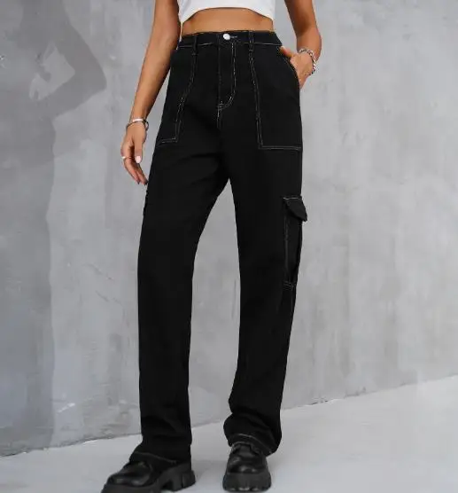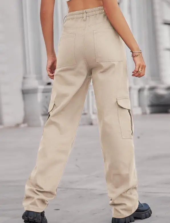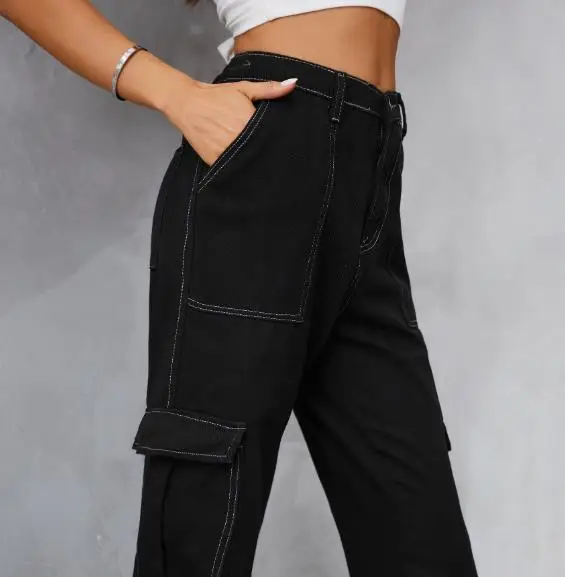 Hnewly New Women's Cargo Wide Leg Pants Pocket Detail and Relaxed Fit Design Casual Fashion Bottoms for Street Wear Denim Pants