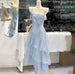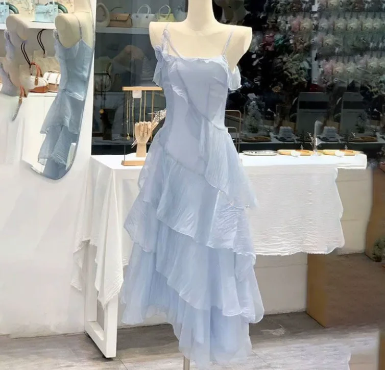 Hnewly Novelty Woman Dress Summer Seaside Vacation Style Fairy Blue Rose Irregular Ruffle Edge Luxury Dress for Women