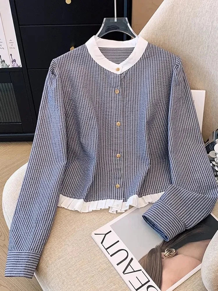 Hnewly O Neck Women Striped Shirt Vintage Long Sleeve Loose Korean Blouse Casual Fall New Patchwork Female Retro Sweet Autumn Tops