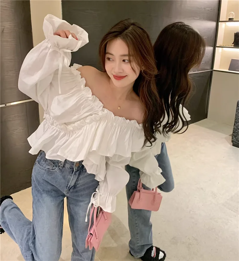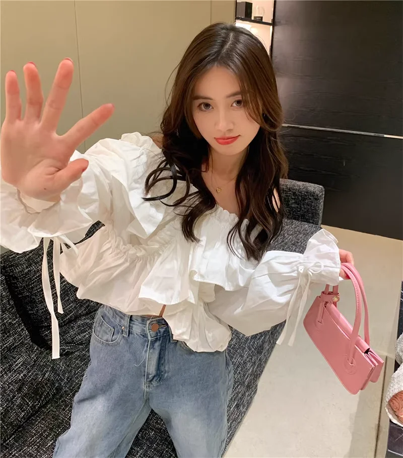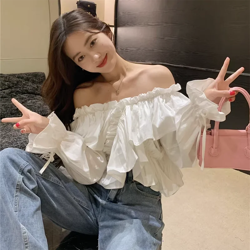 Hnewly Off Shoulder Ruffles White Shirt Women Flare Sleeve Sexy Cropped Slim Blouse Korean Fashion Slash Neck Female Elegant Tops