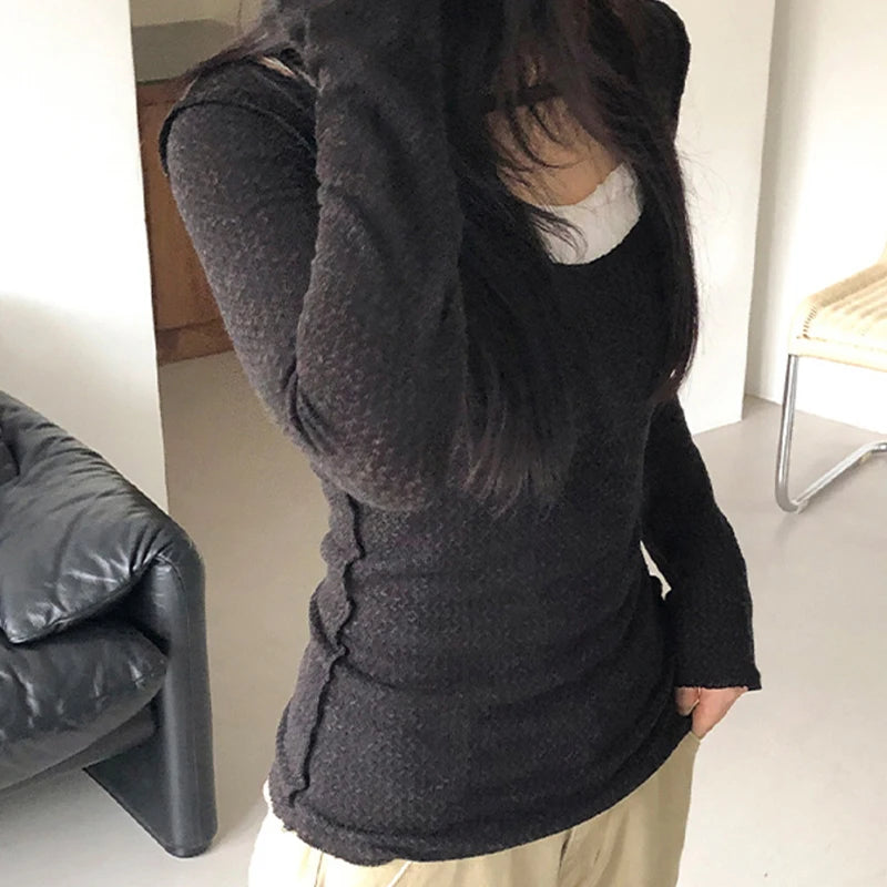 Hnewly Patchwork Fake Two-piece T-shirt Autumn Winter Furry Stitching Full Sleeve Elastic Knitwears Korean Style T Shirts Casual