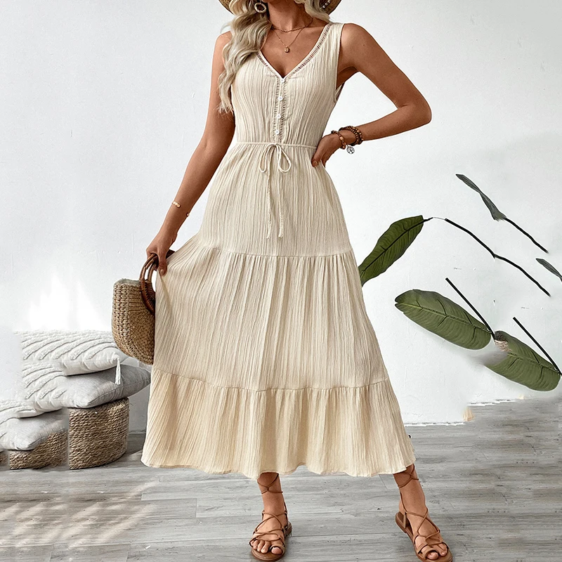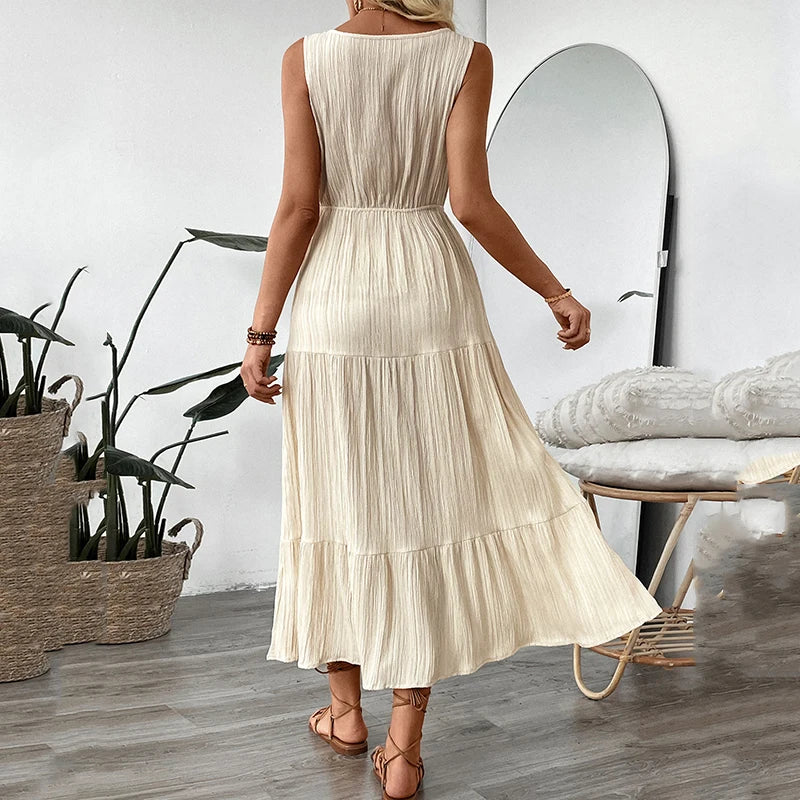 Hnewly Patchwork V Neck Bohemian Midi Dress Women Summer Sleeveless Beach Vacation Long Dresses Woman Buttons A Line Sundress Female